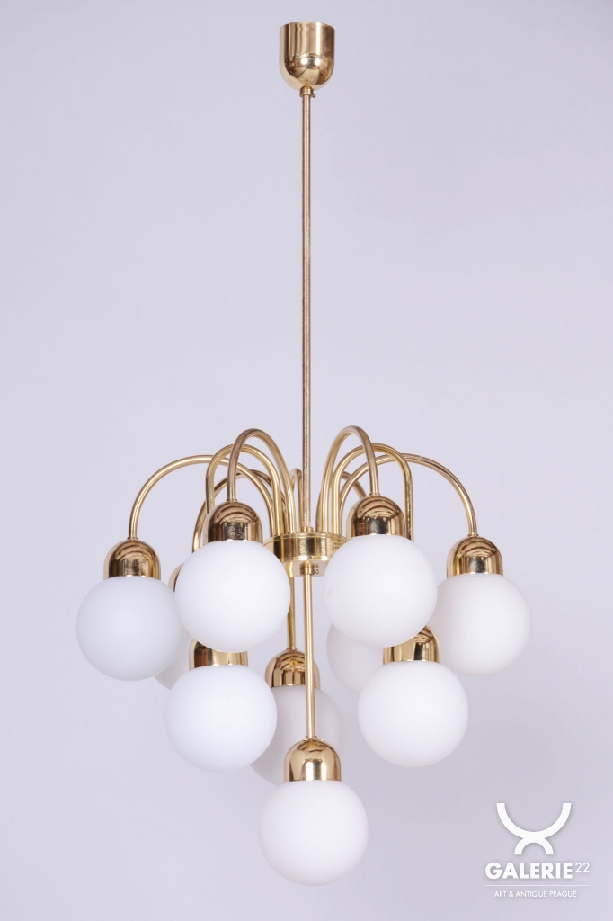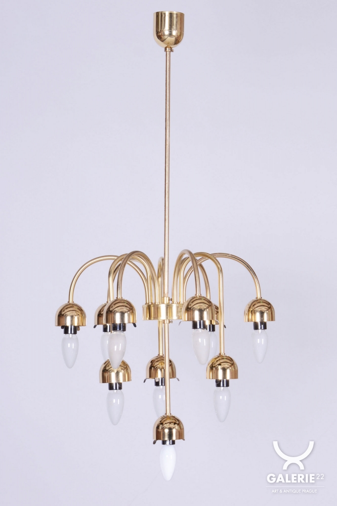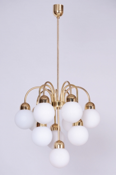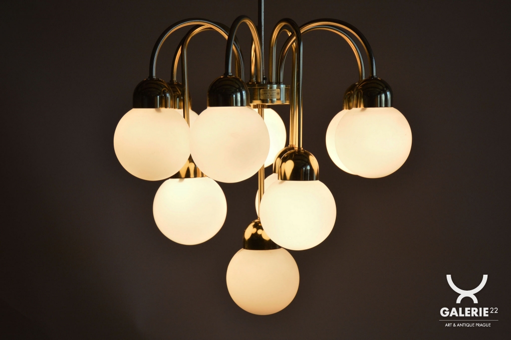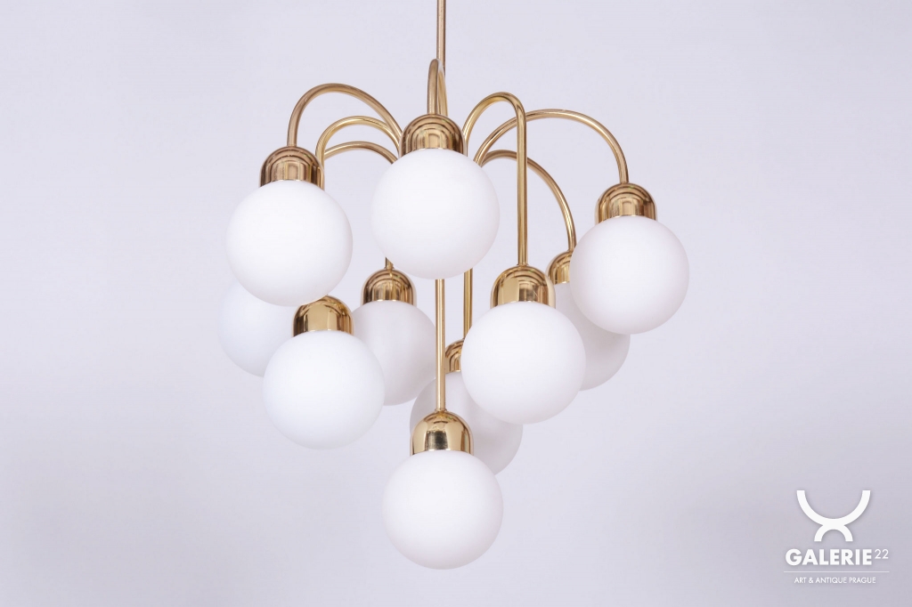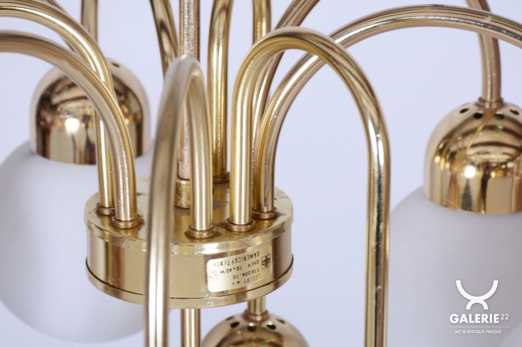 This ten-arm chandelier is an elegant representative of 1950s Czechoslovak design, produced in the renowned glassworks of Kamenický Šenov. The fixture embodies post-war optimism and lightness, with its subtle construction and gracefully curved arms creating a harmonious visual whole. The foundation consists of professionally cleaned brass, which has regained its natural golden luster after restoration, providing a luxurious contrast to the milky glass.