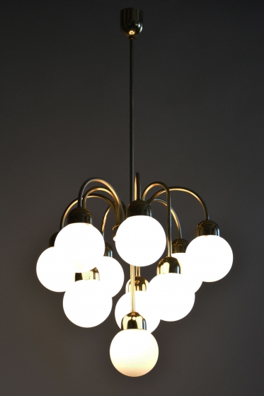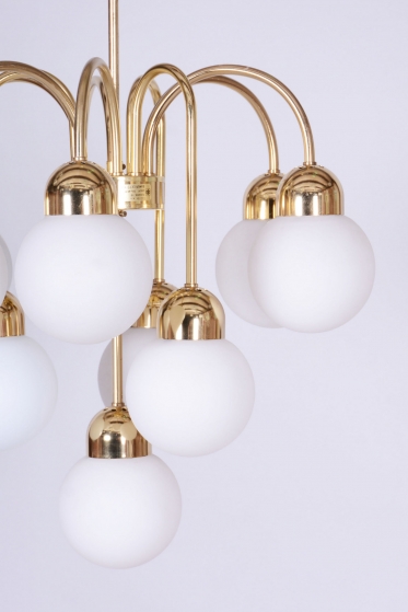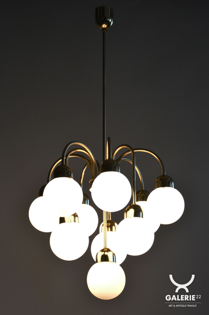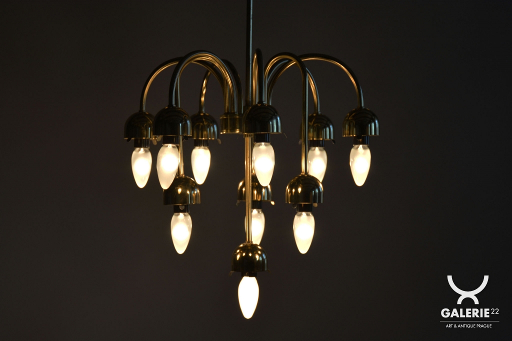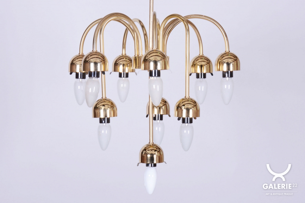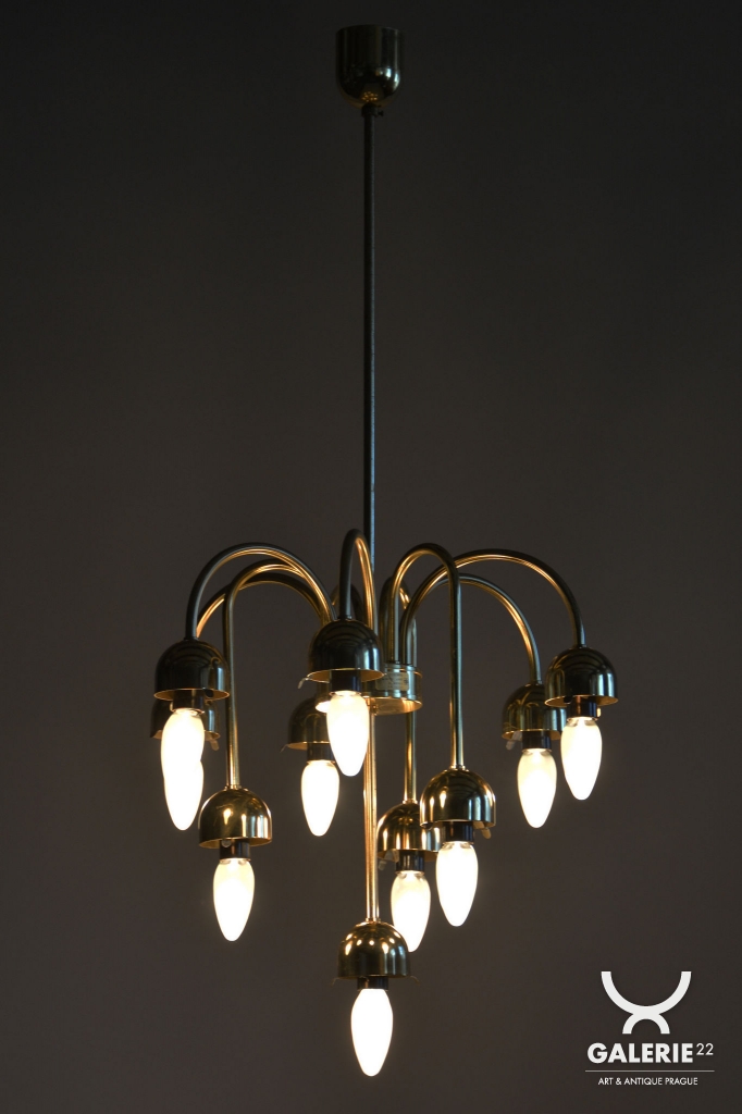 This ten-arm chandelier is an elegant representative of 1950s Czechoslovak design, produced in the renowned glassworks of Kamenický Šenov. The fixture embodies post-war optimism and lightness, with its subtle construction and gracefully curved arms creating a harmonious visual whole. The foundation consists of professionally cleaned brass, which has regained its natural golden luster after restoration, providing a luxurious contrast to the milky glass.