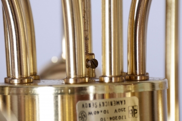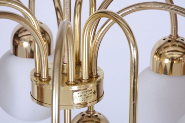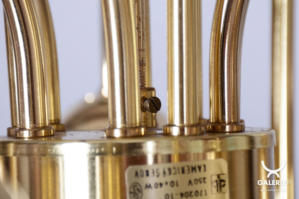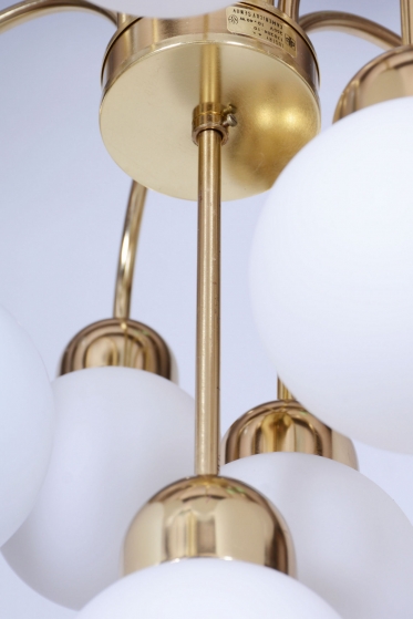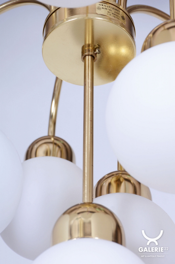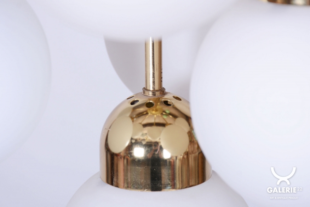 The lighting performance is provided by six white opal glass shades with a diameter of 15 cm, featuring a timeless spherical shape. These shades perfectly diffuse light throughout the room without causing glare, creating a very pleasant and warm atmosphere. Each arm terminates in a brass cup that securely holds the glass bulb, highlighting the precise craftsmanship typical of the Šenov production line.