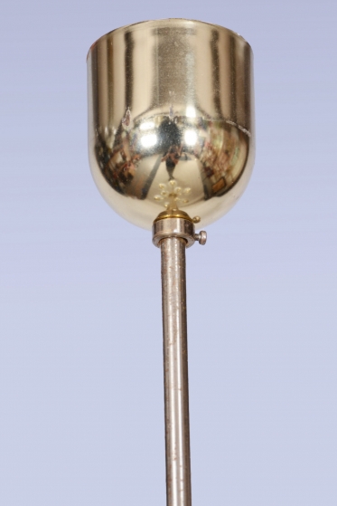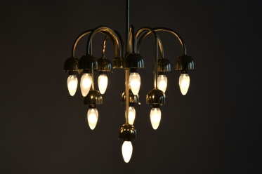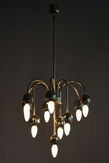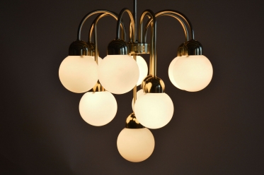 The item has undergone a complete professional overhaul, including new wiring that meets current safety standards. The chandelier is equipped with standard E14 sockets, allowing for the easy use of modern LED bulbs. With its clean design and top-tier condition, this chandelier is an ideal central light fixture for dining rooms, living rooms, or bedrooms in both retro and contemporary styles.