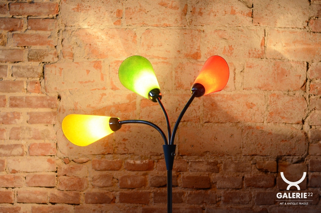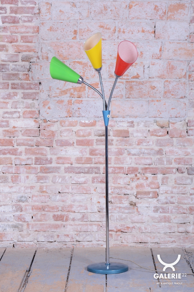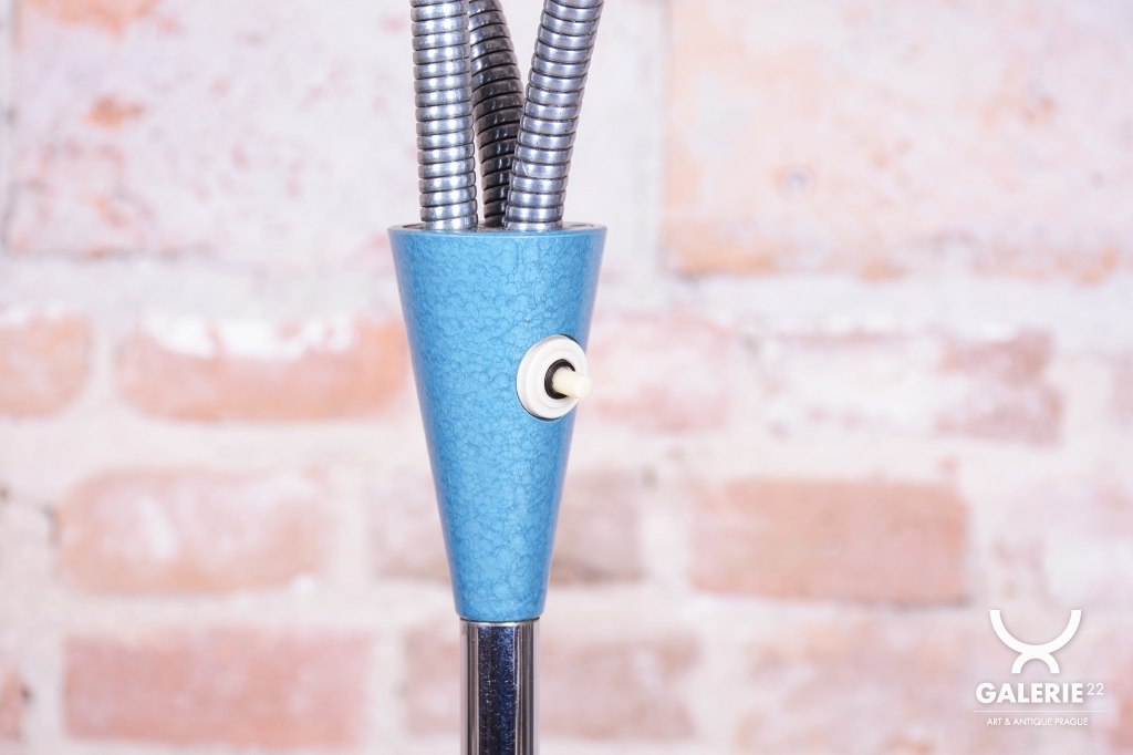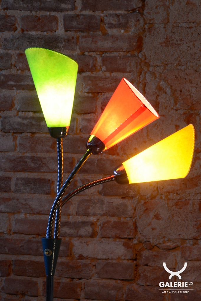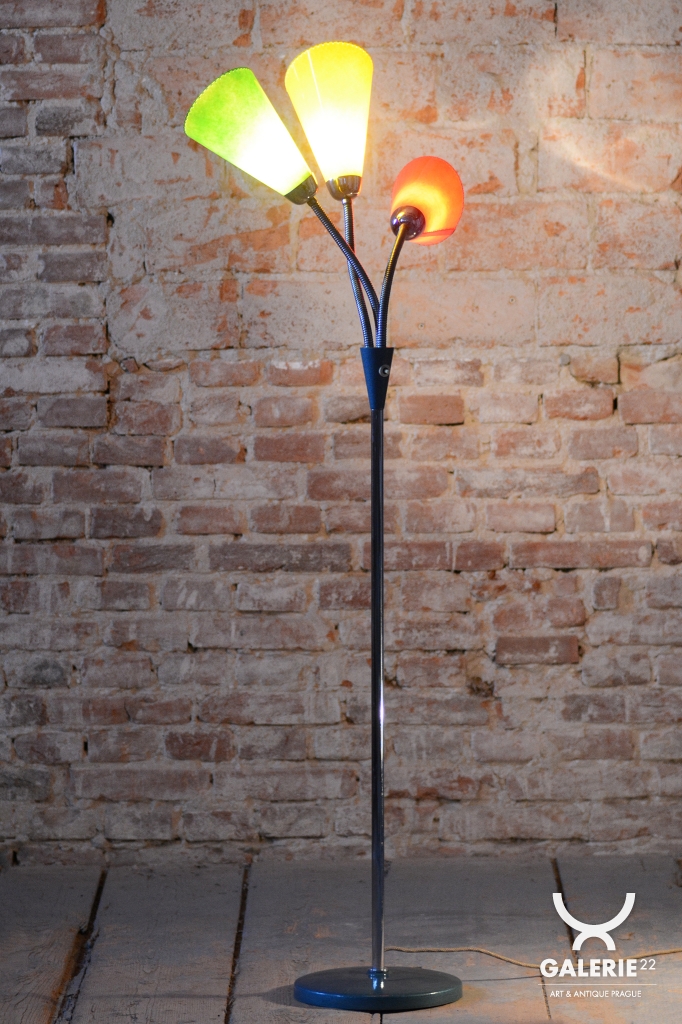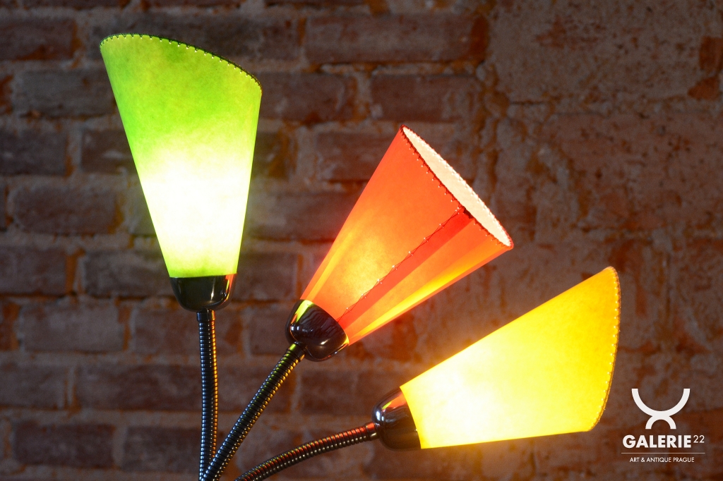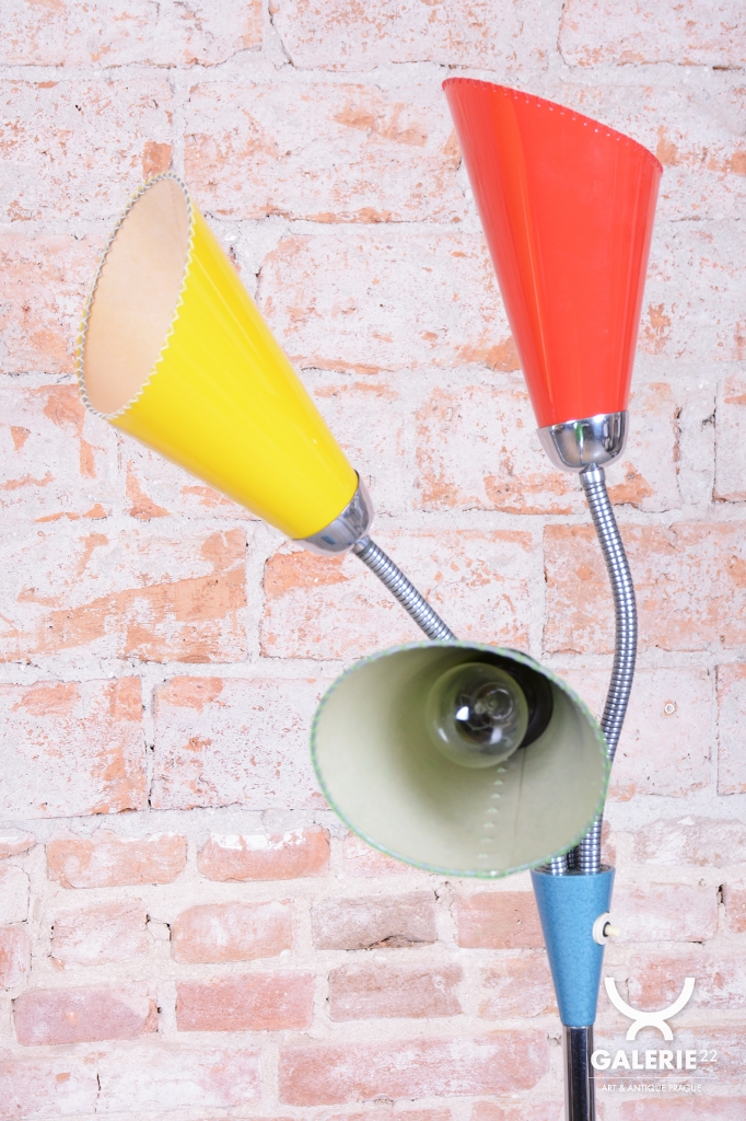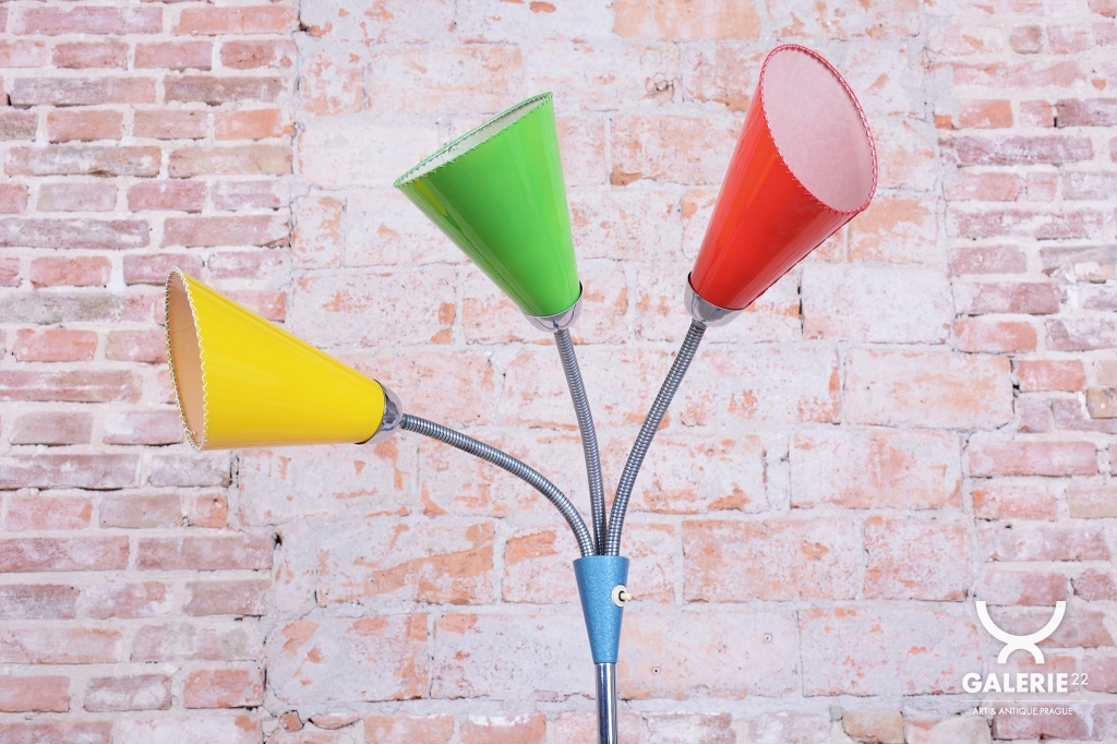 This iconic floor lamp, commonly nicknamed "Goose Necks," is a prominent symbol of Czechoslovak design from the 1960s. The company Lidokov, based in Boskovice, manufactured this piece as TYPE S 102. The lamp represents the peak of Mid-Century aesthetics, where colorful playfulness meets the industrial elegance of chrome.