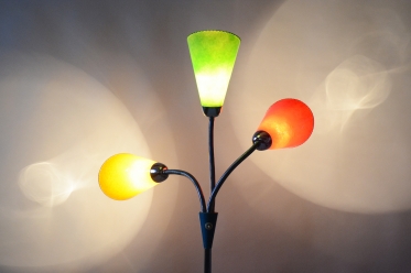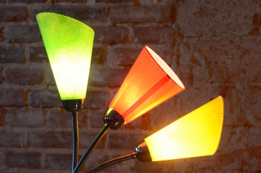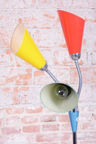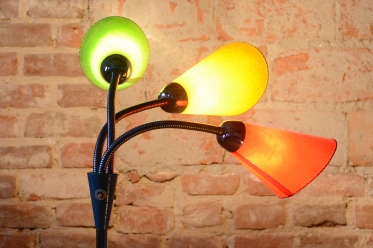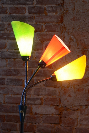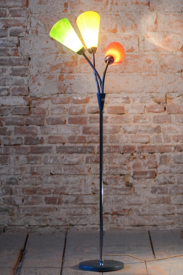 The construction consists of a solid base made of painted cast iron and arms made of chrome-plated steel. These arms are fully adjustable. This feature allows the user to direct the light from all three shades as needed. The shades consist of colored foil and remain in a very good state. The entire piece underwent a restoration process. This included professional cleaning of the chrome to a high luster and a complete expert revision of the electrical wiring. The lamp is fully functional. Due to its timeless look, it is a highly sought-after centerpiece for both modern and retro interiors.