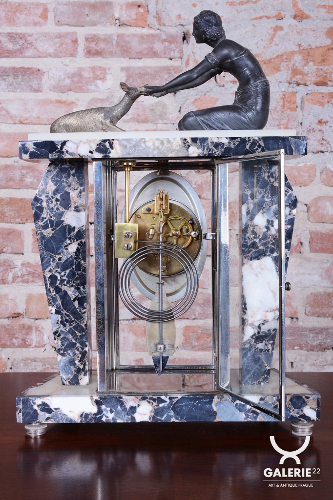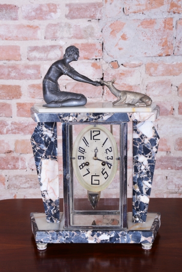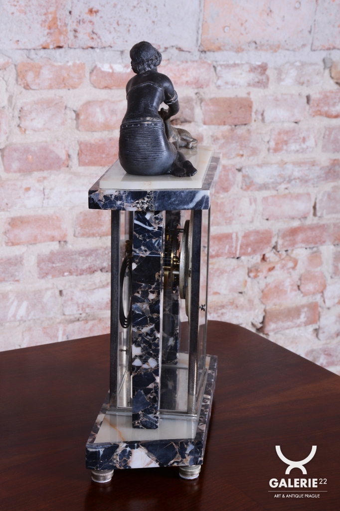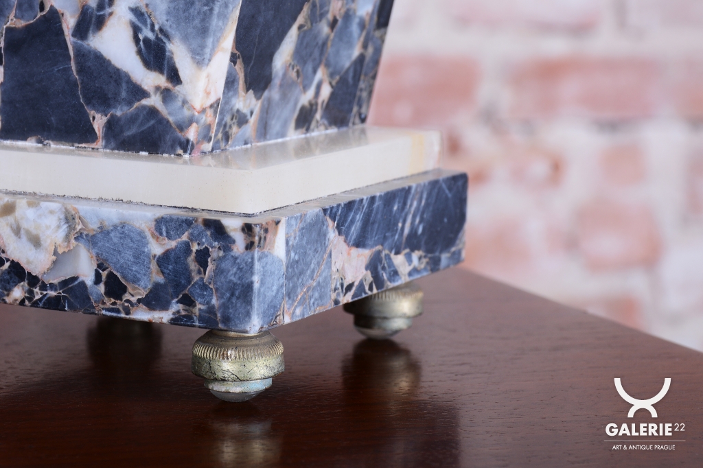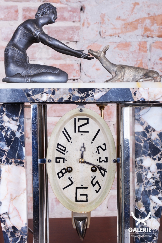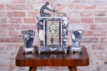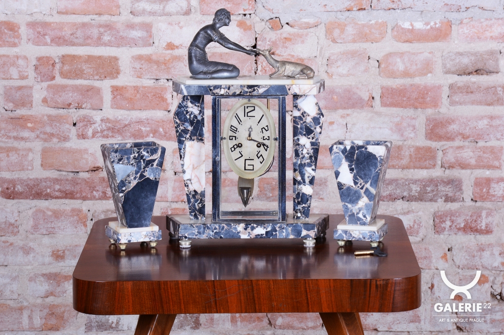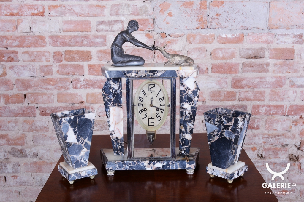 This mantel clock set is a masterpiece of French Art Deco from the 1920s. It is a representative suite that embodies the luxury and elegance of French society during that era. The entire set features a monumental marble design. The combination of different stone shades creates a harmonious and architectural look.