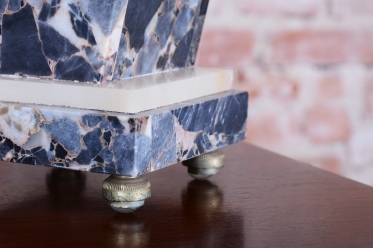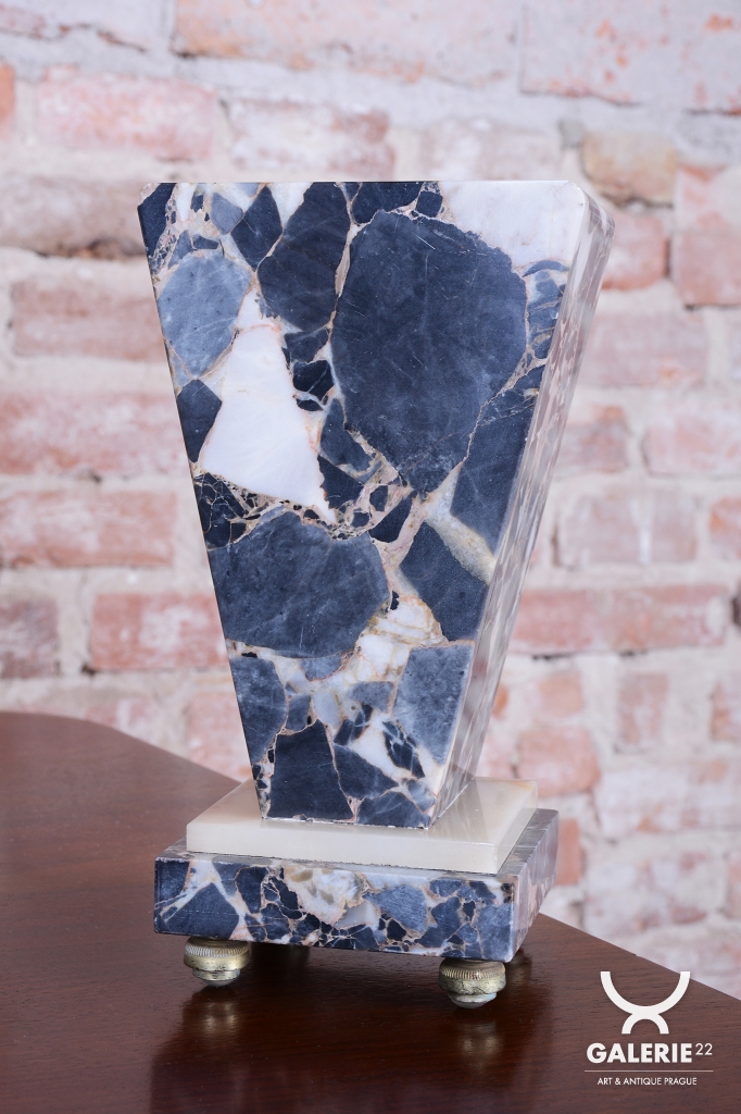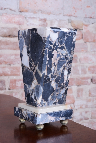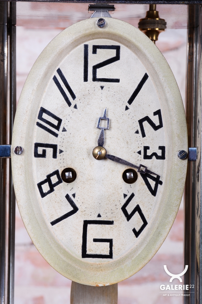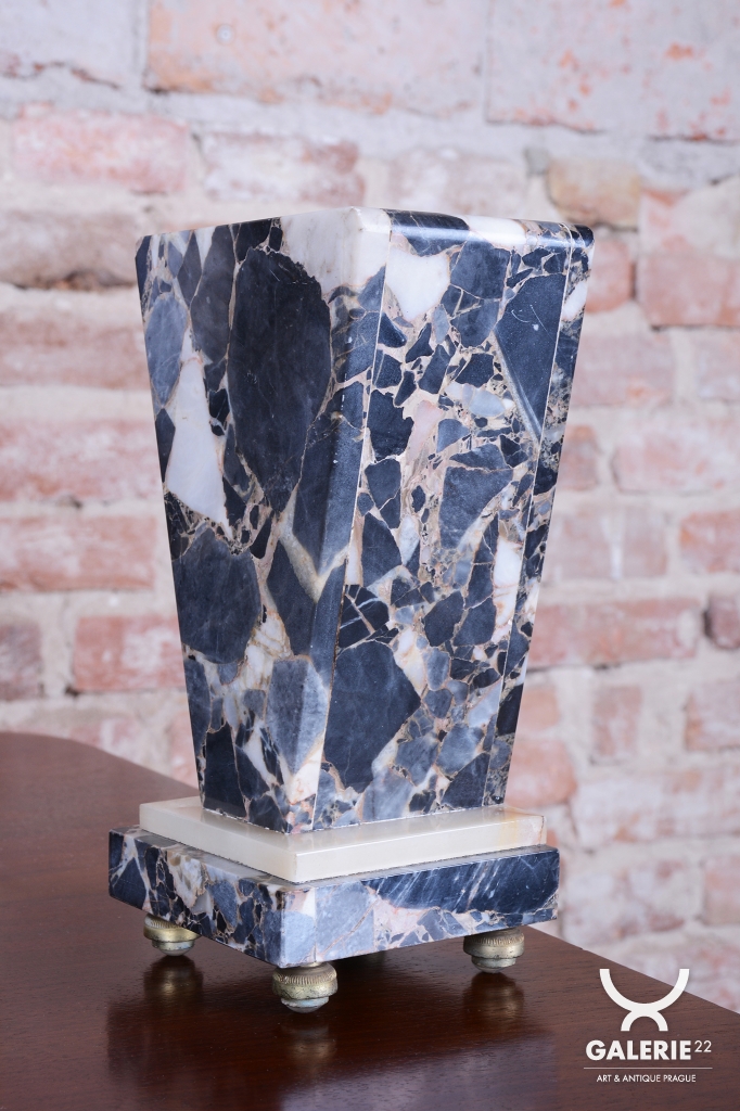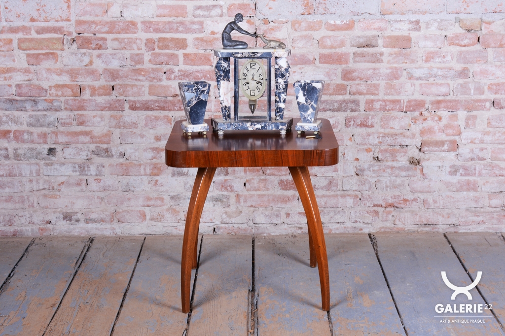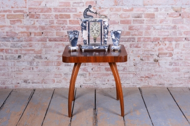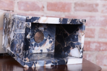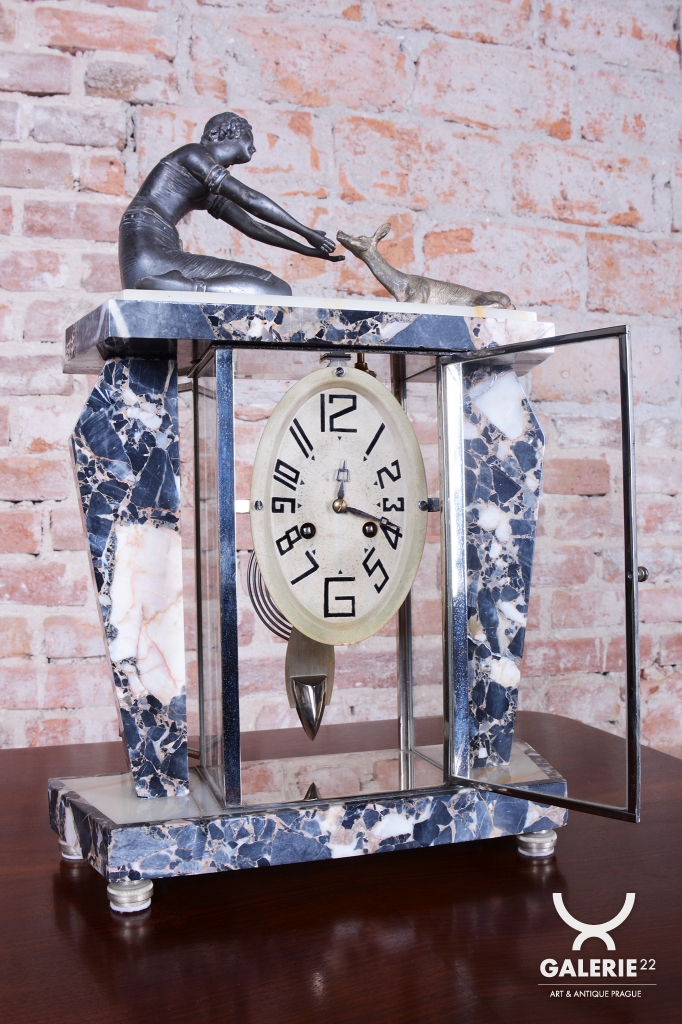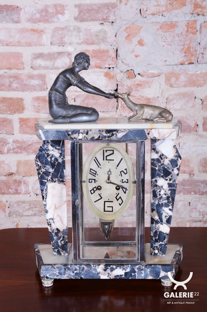 This mantel clock set is a masterpiece of French Art Deco from the 1920s. It is a representative suite that embodies the luxury and elegance of French society during that era. The entire set features a monumental marble design. The combination of different stone shades creates a harmonious and architectural look.