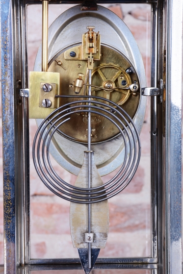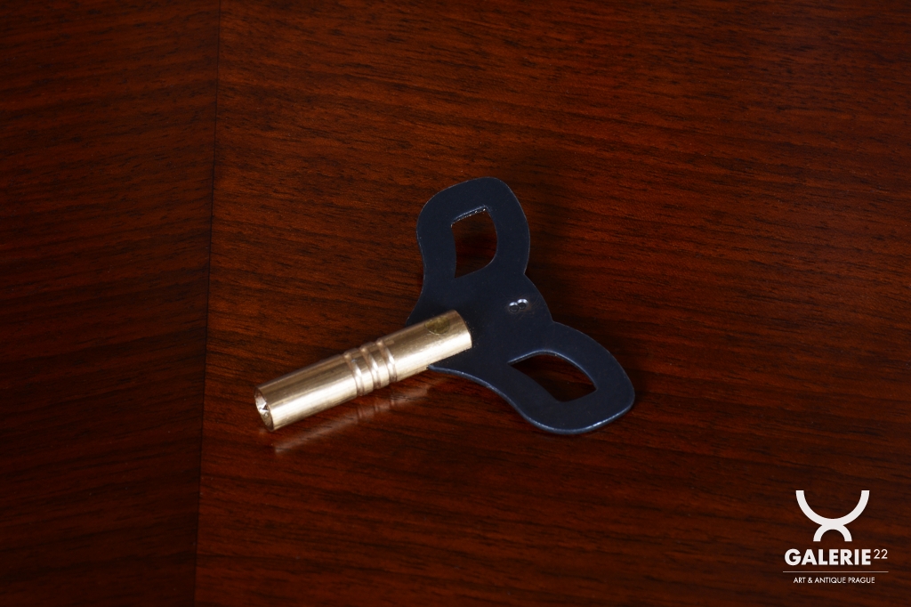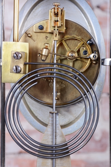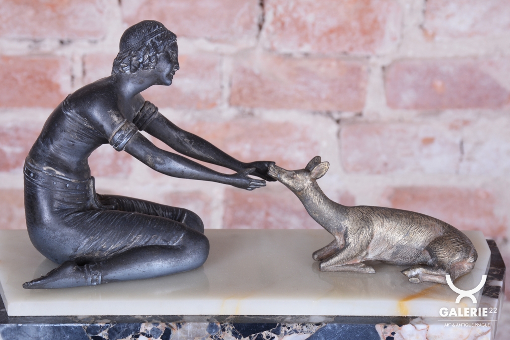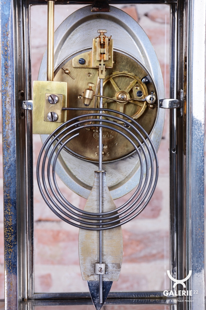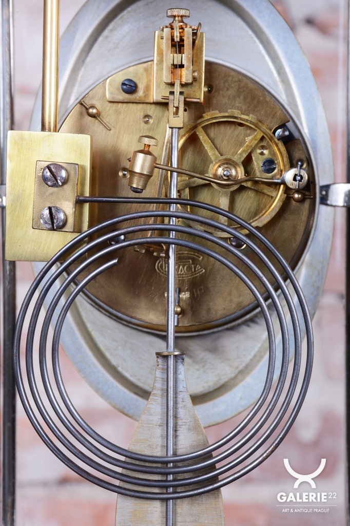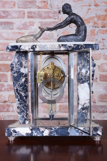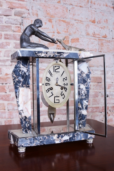 The clocks feature precise bronze sculptures. These add artistic depth and dynamic energy to the set. The dial remains safely hidden under clear glass to protect its delicate details. A refurbished and fully functional clock movement serves as the mechanical heart of the piece. The entire set underwent a restoration process. The accompanying marble accessories can also function as stylish candlesticks. This three-piece mantel garniture is a perfect centerpiece for any interior that requires a touch of aristocratic taste and historical authenticity.