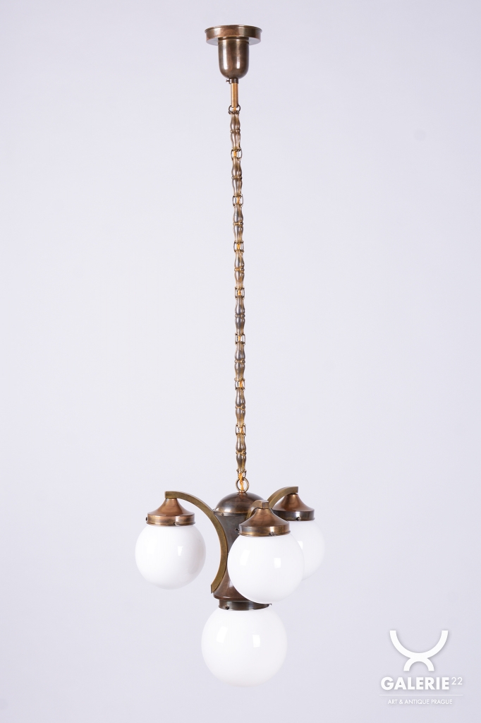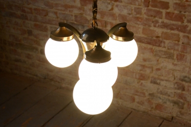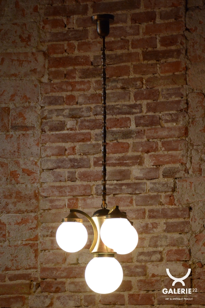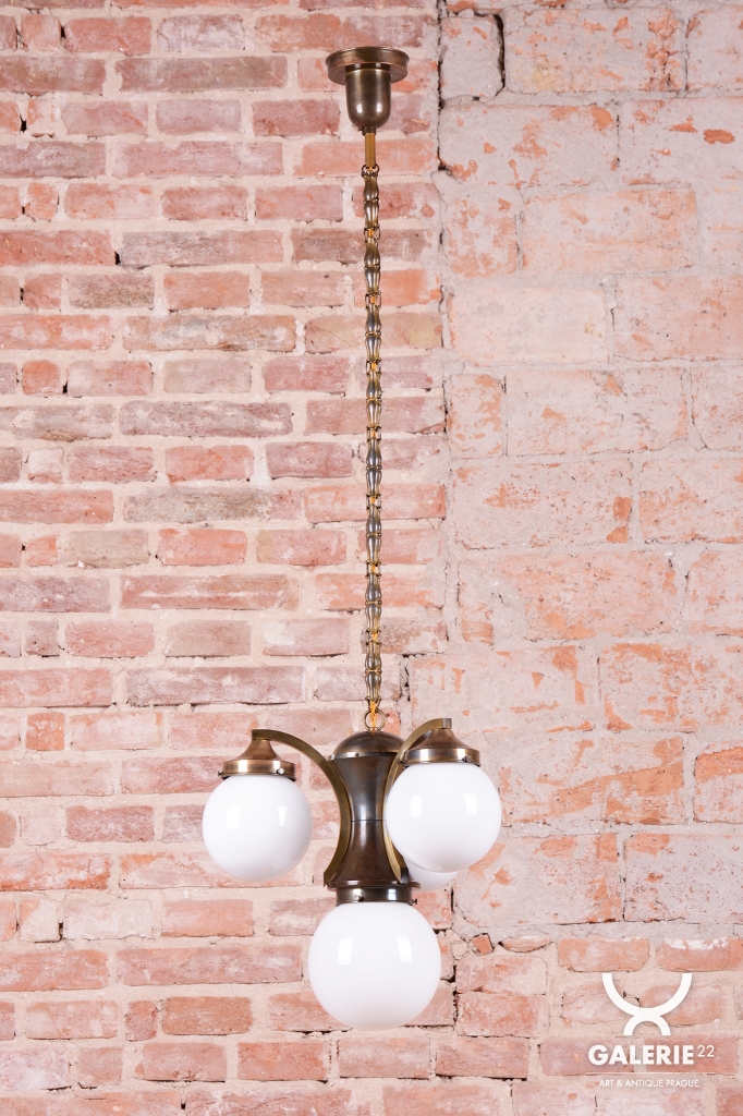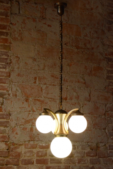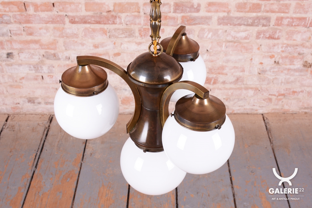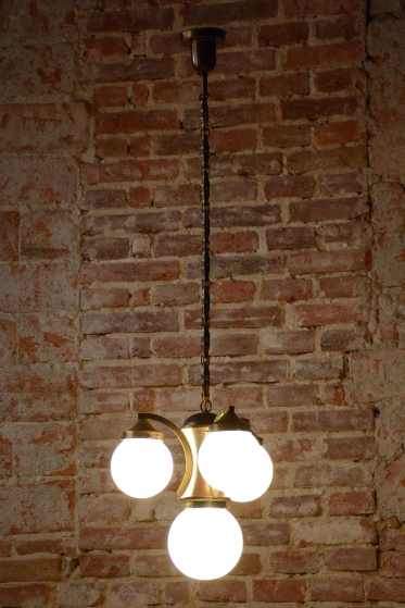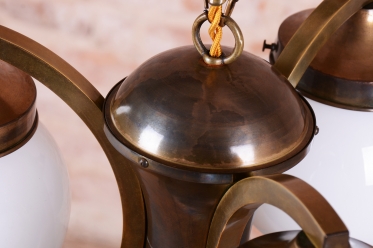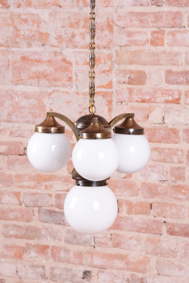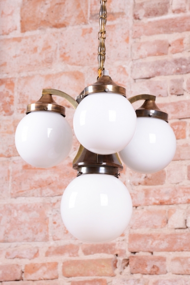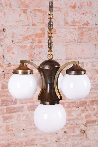 The item has undergone a complete restoration process. The patinated brass construction was professionally cleaned to highlight its natural beauty and historical character. The fixture is fitted with opal glass shades, which create a soft and pleasant atmosphere in the room. A practical advantage of this model is the adjustable length of the hanging chain, ranging from 49 to 42 cm, allowing the height of the lamp to be adapted to the specific needs of the space. The chandelier has new electrical wiring, is fully functional, and ready for immediate use.