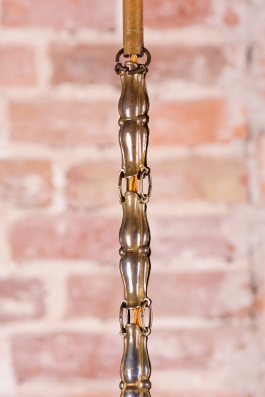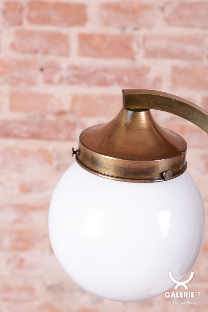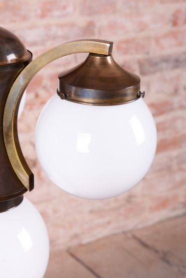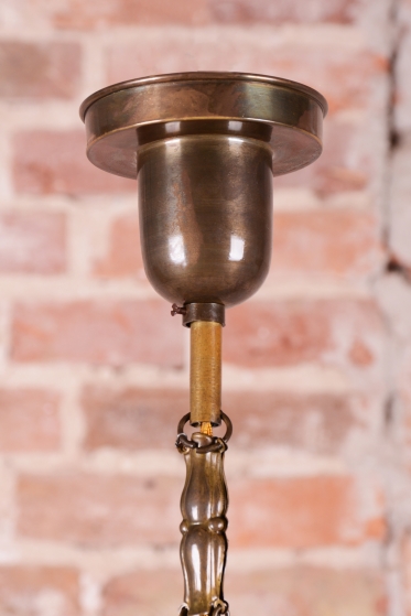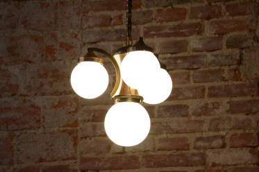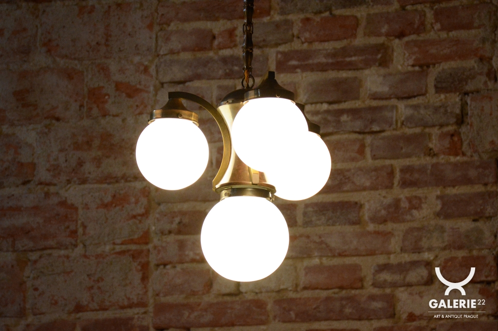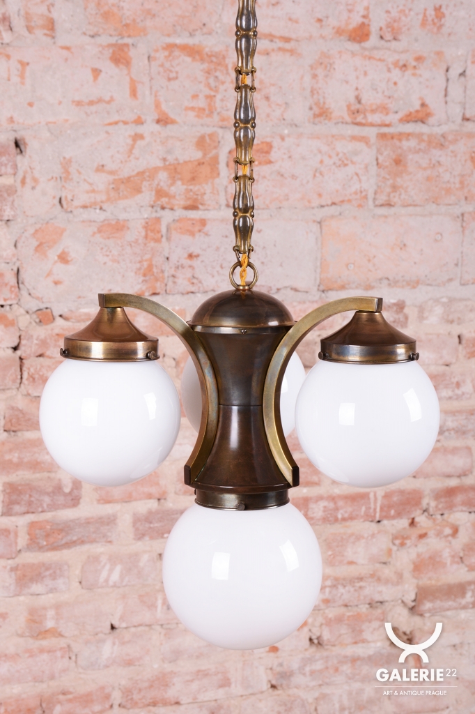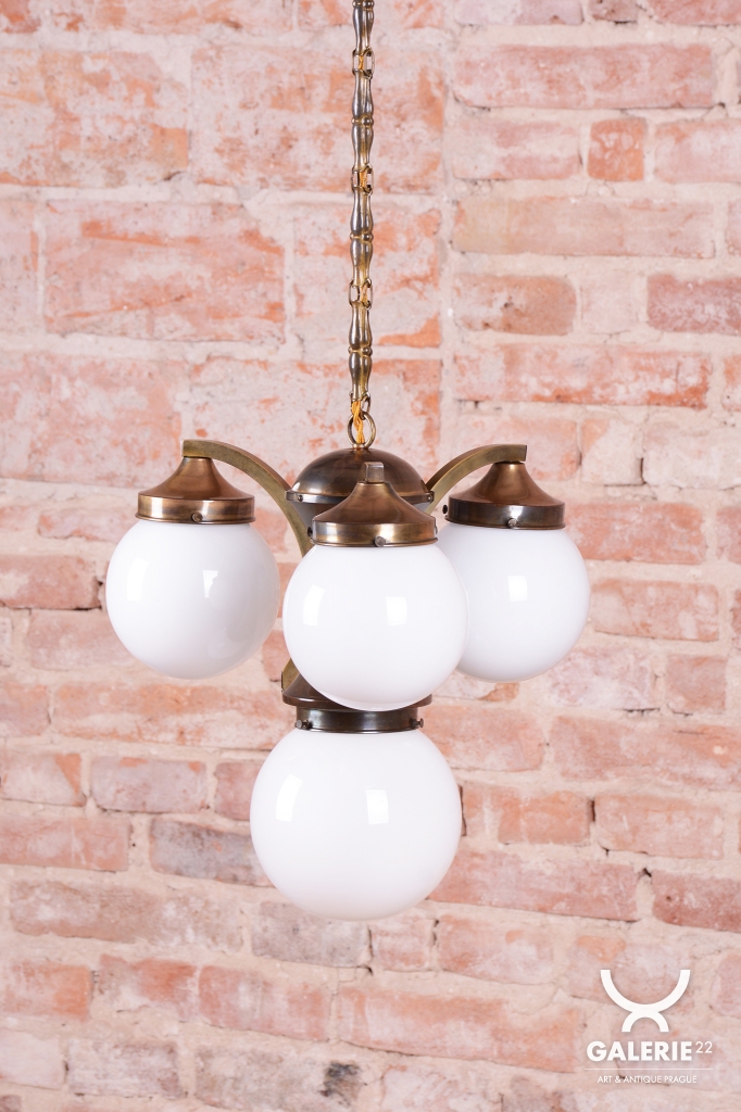 The item has undergone a complete restoration process. The patinated brass construction was professionally cleaned to highlight its natural beauty and historical character. The fixture is fitted with opal glass shades, which create a soft and pleasant atmosphere in the room. A practical advantage of this model is the adjustable length of the hanging chain, ranging from 49 to 42 cm, allowing the height of the lamp to be adapted to the specific needs of the space. The chandelier has new electrical wiring, is fully functional, and ready for immediate use.