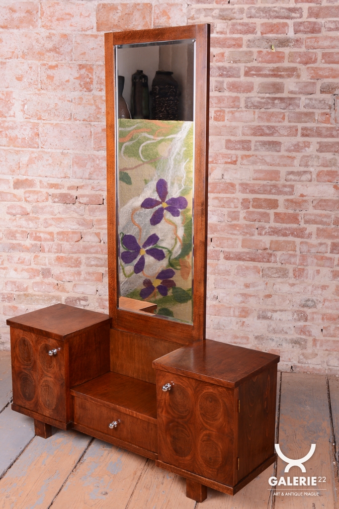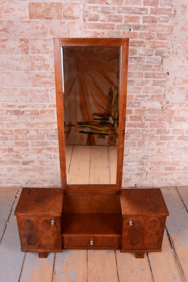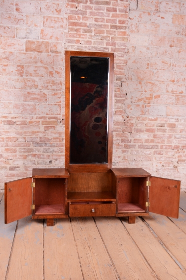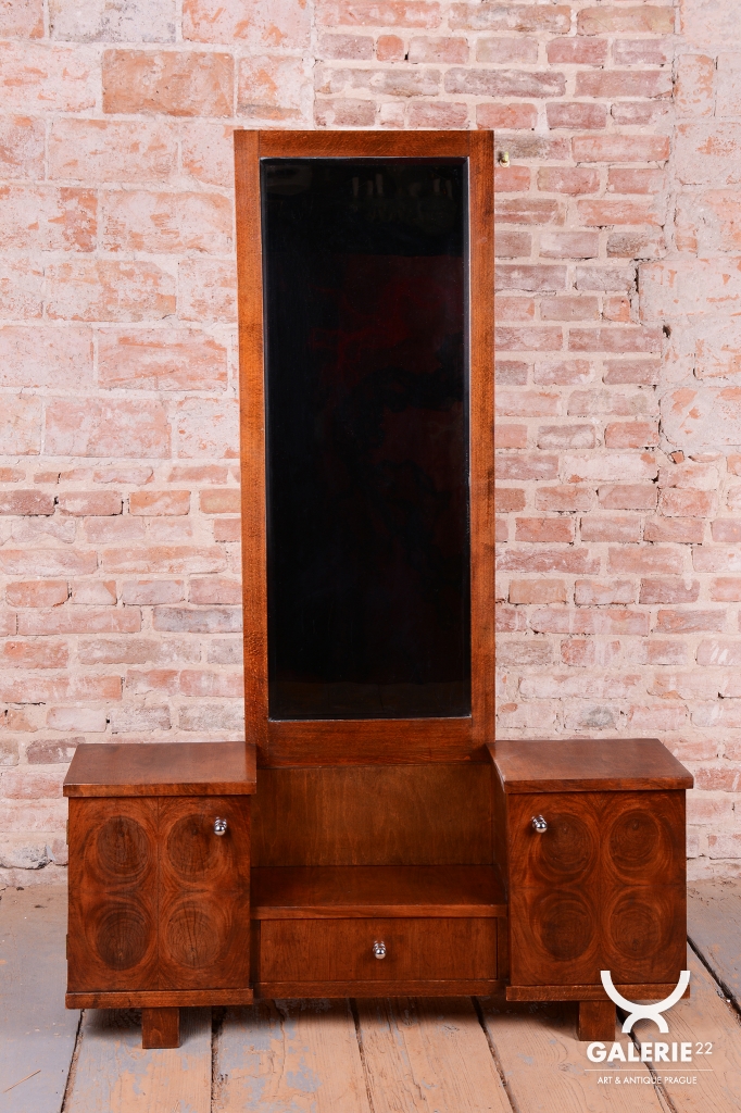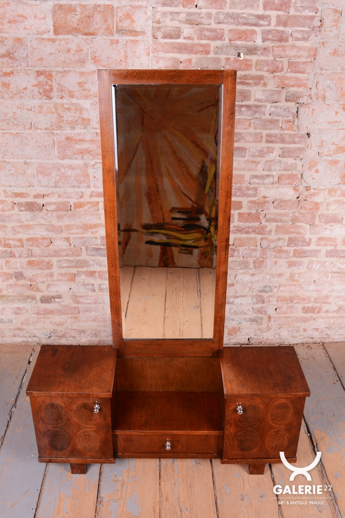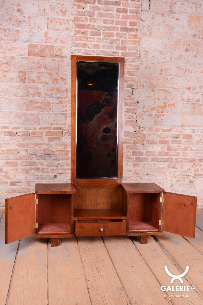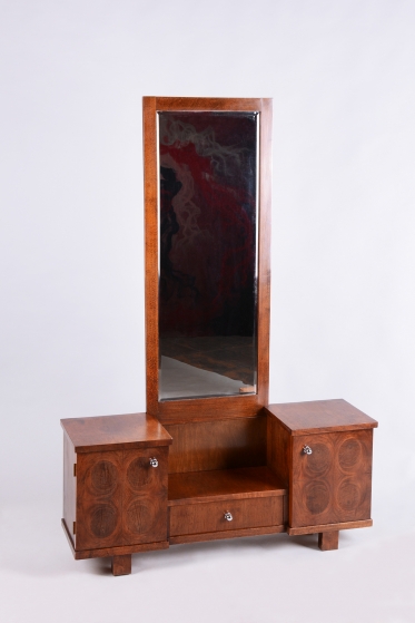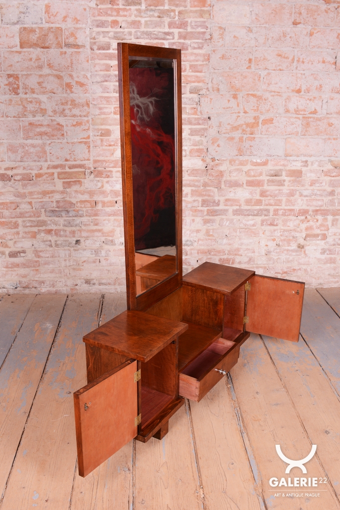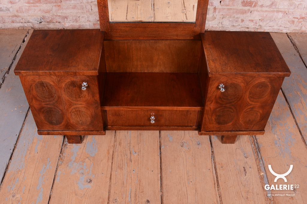 This dressing table (vanity) is the embodiment of elegance and femininity in 1930s interiors. During the peak of the Art Deco period, vanity tables became an indispensable element of modern bedrooms and boudoirs, serving as an intimate space for daily care. This piece stands out with its harmonious blend of geometric rigor and the warm texture of natural wood, characteristic of the Czechoslovak furniture school of that era.