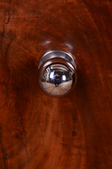 The item has undergone comprehensive restoration. The body is veneered in rich walnut, with the original wood polish sensitively refreshed to highlight the deep grain and honey-colored tones. The vanity is fitted with its original faceted mirror, which is in excellent condition, beautifully refracting light through its beveled edges. A modernist accent is provided by the chrome-plated steel handles, which have been perfectly polished to a high luster. The dressing table offers practical storage space and, thanks to its noble appearance, will become a centerpiece in any interior.
