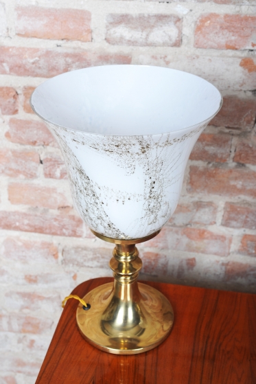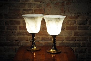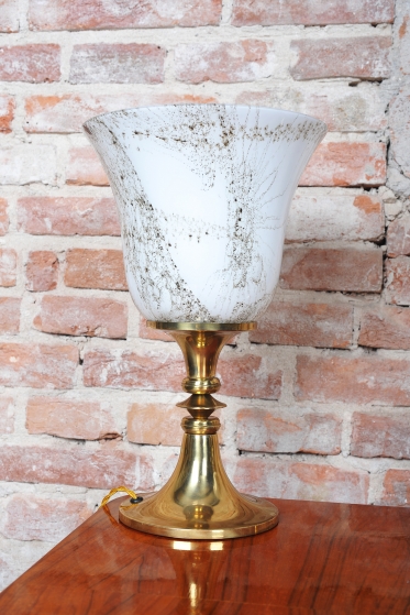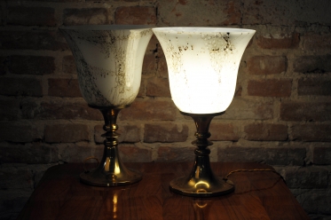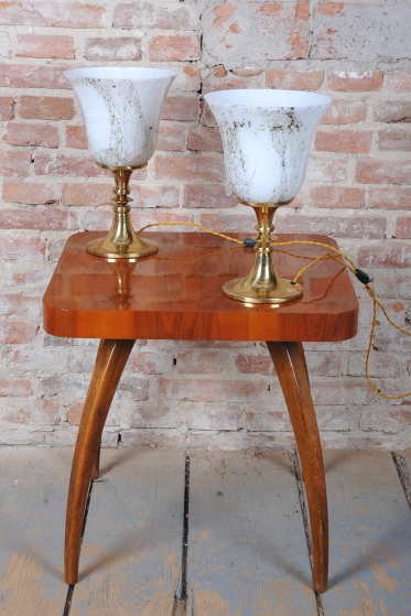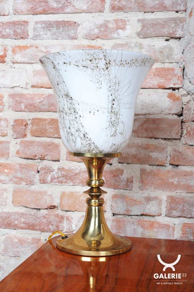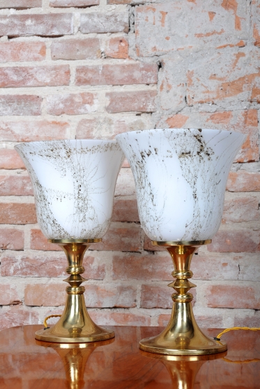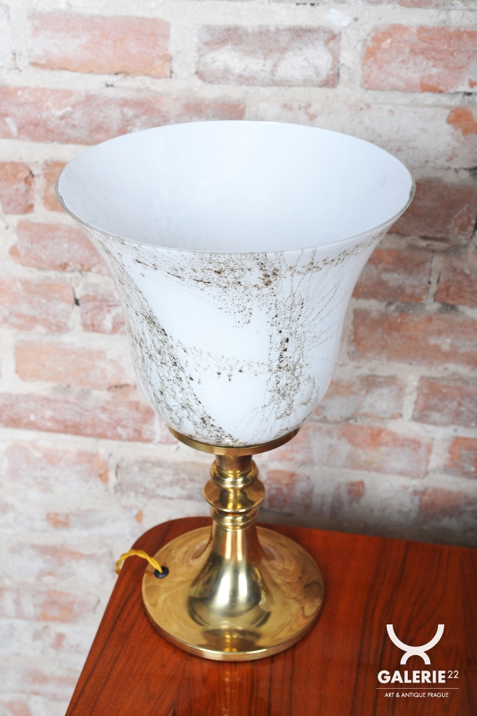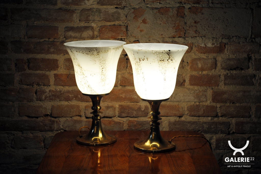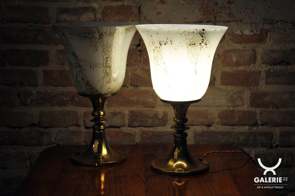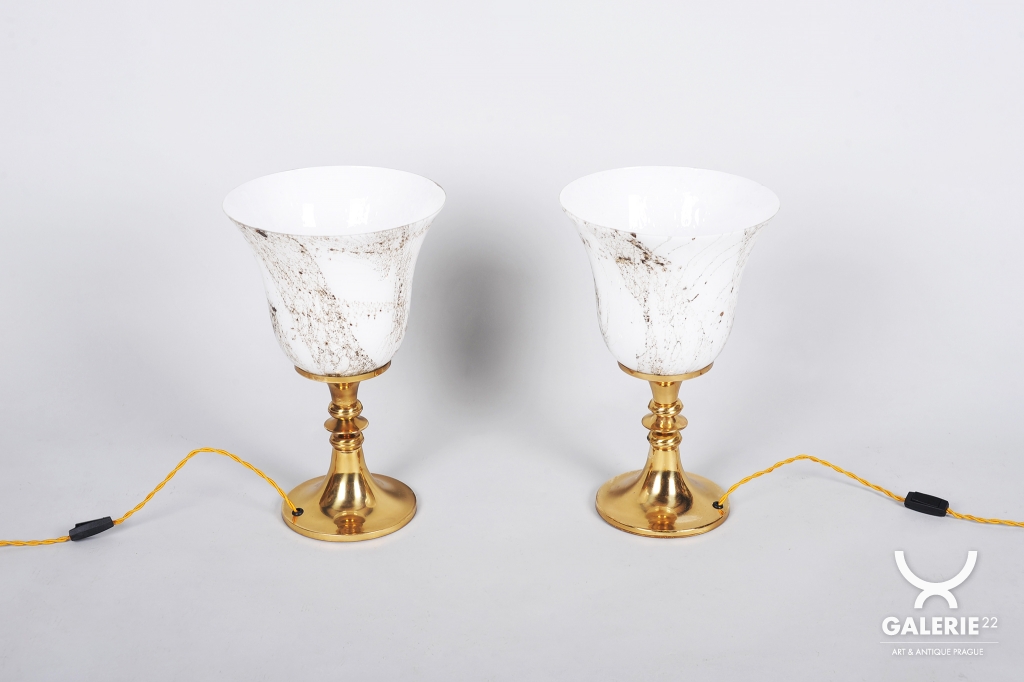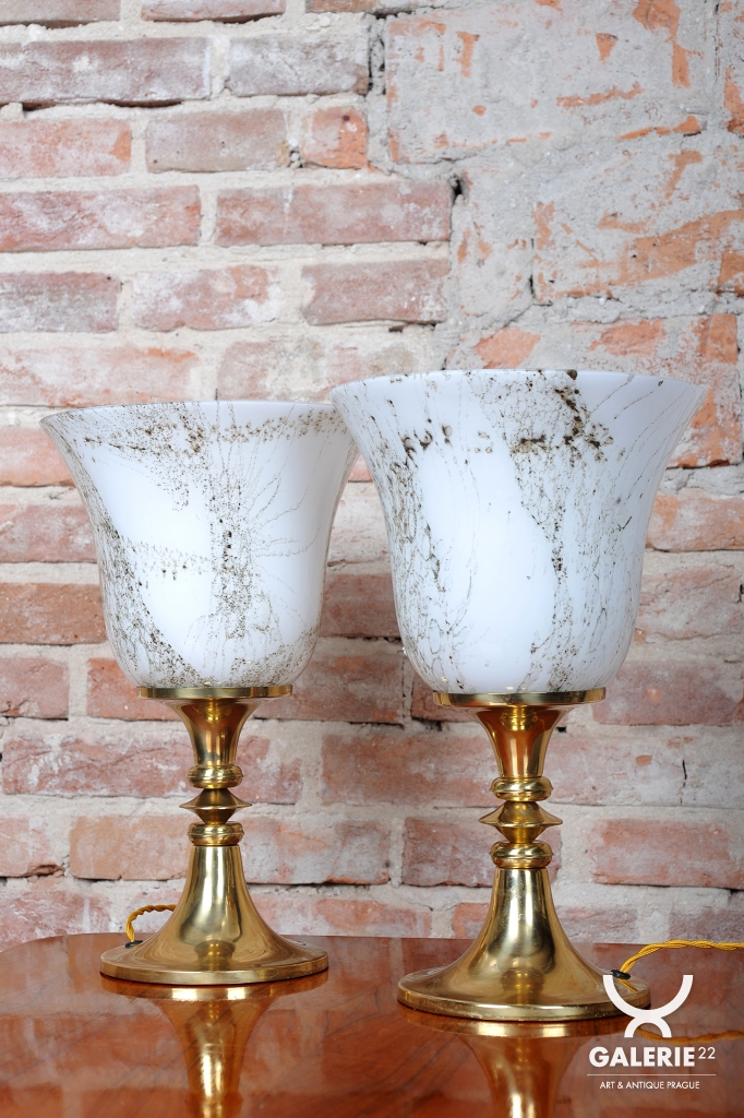 The primary visual centerpiece is the large shades made of marbled glass, shaped like an open goblet. Their specific texture creates a very warm and pleasant atmosphere when lit. The subtle marbling on the white background gives each piece a unique pattern and ensures a soft diffusion of light, ideal for creating a cozy setting on bedroom nightstands or as accent lighting in a living room. The contrast between the cool, smooth glass and the precisely crafted brass highlights the high level of craftsmanship typical of Czechoslovak production from that era.