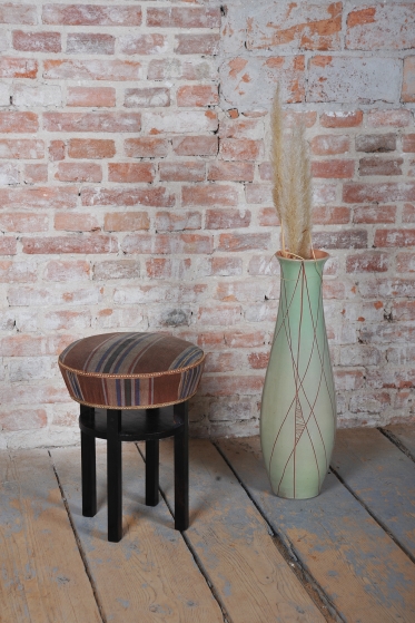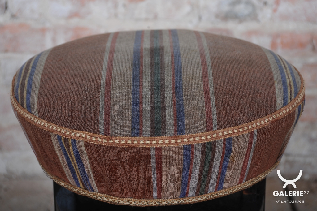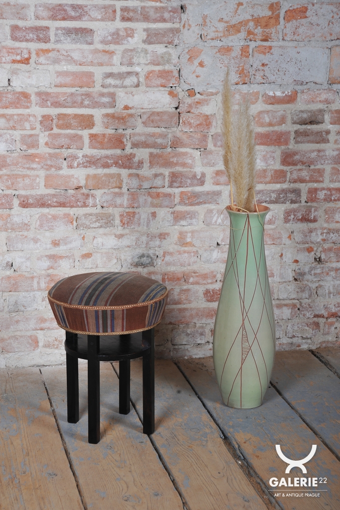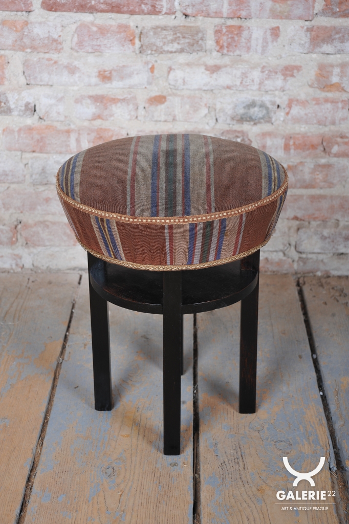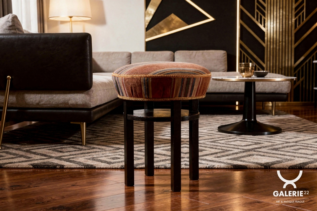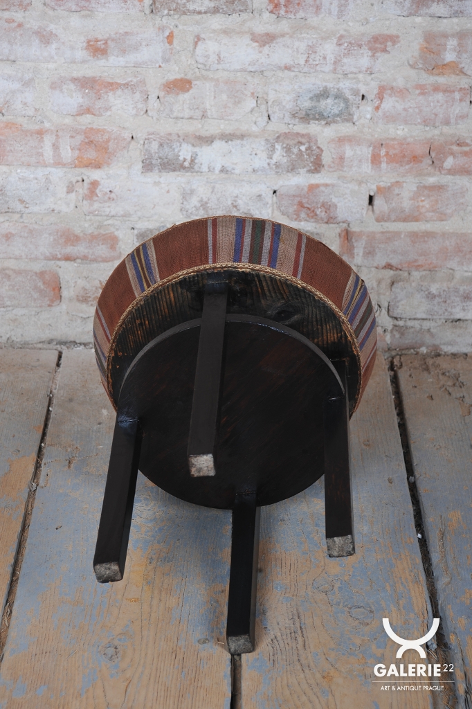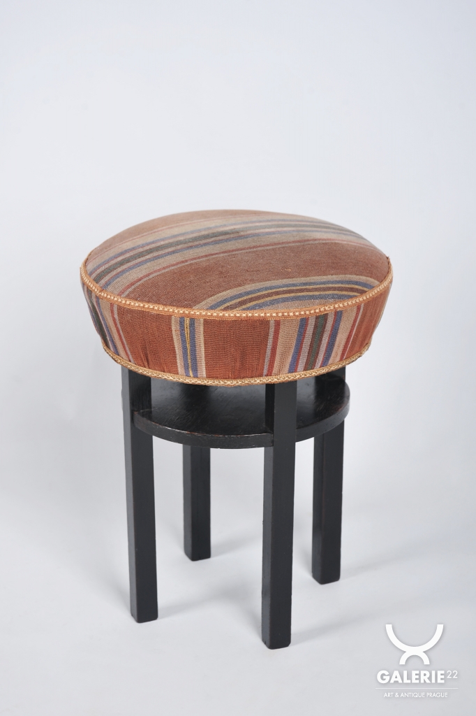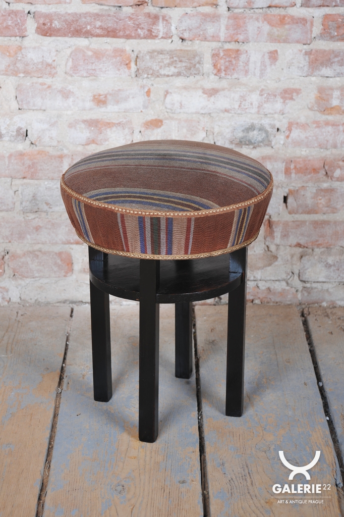 This stool (taboret) is a noble representative of 1920s Czechoslovak Art Deco, embodying the characteristic geometric rigor and elegance of the interwar era. The structure is crafted from ebonized oak, whose deep dark hue has been enhanced through the revival of the original polish during restoration. This finish highlights the woods subtle luster while protecting its natural texture. The four slender legs are functionally and aesthetically connected by a circular shelf in the upper part, providing stability and visual lightness to the piece.