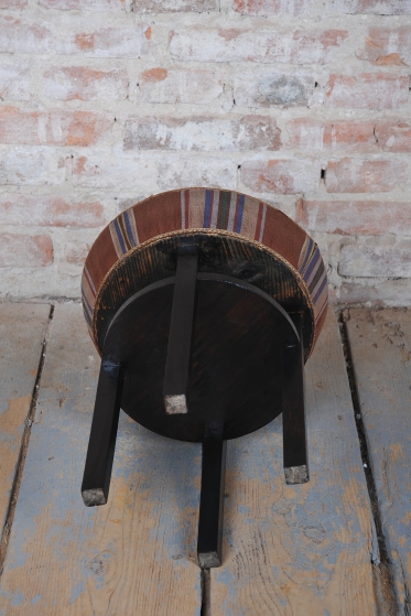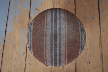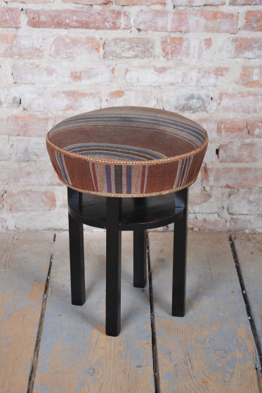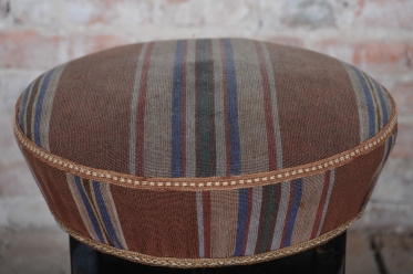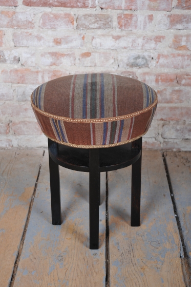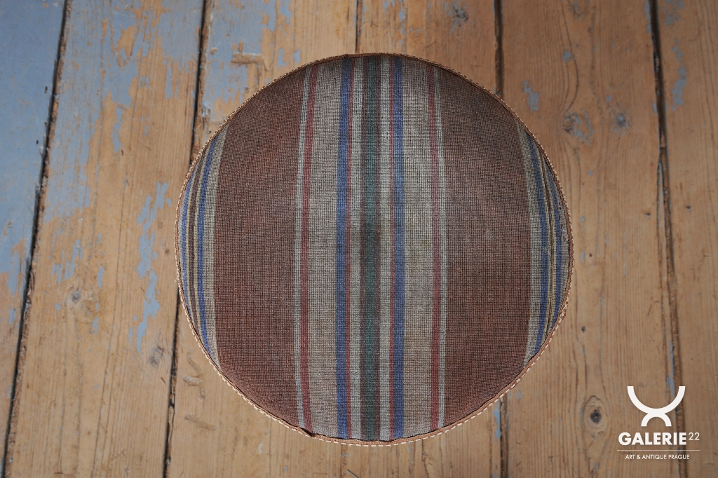 An exceptional feature of this item is the extraordinarily well-preserved upholstery, which is not sunken and has maintained its original integrity. The stool is covered in its original fabric with a delicate striped pattern in earthy tones, which has been professionally machine-cleaned to restore its clarity while preserving its authentic historical patina. The upper edge of the seat is trimmed with a decorative braid (gimp), highlighting the meticulous craftsmanship and attention to detail that was standard for First Republic custom manufacturing.