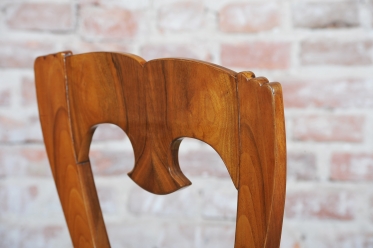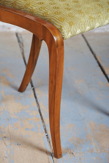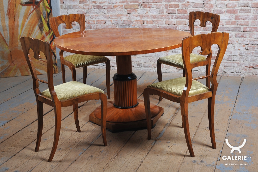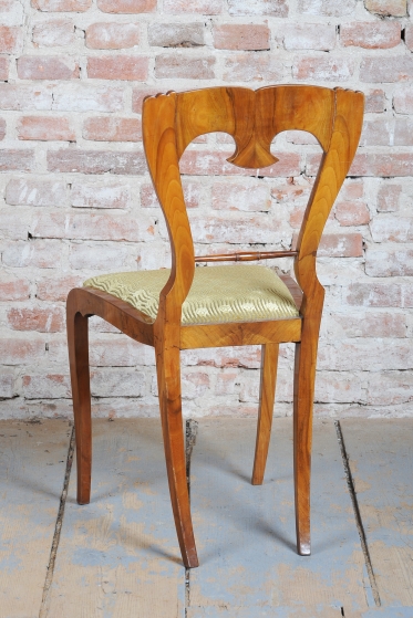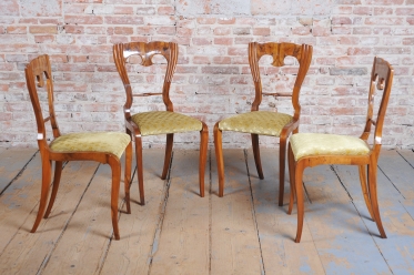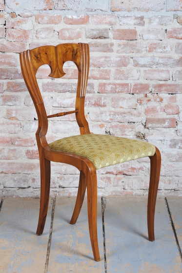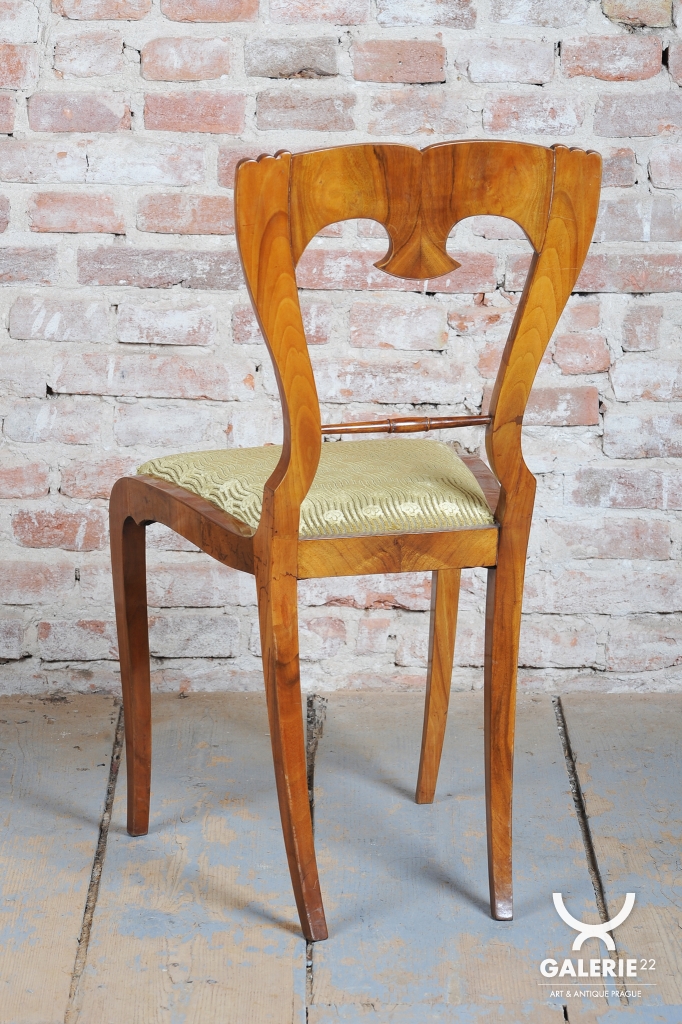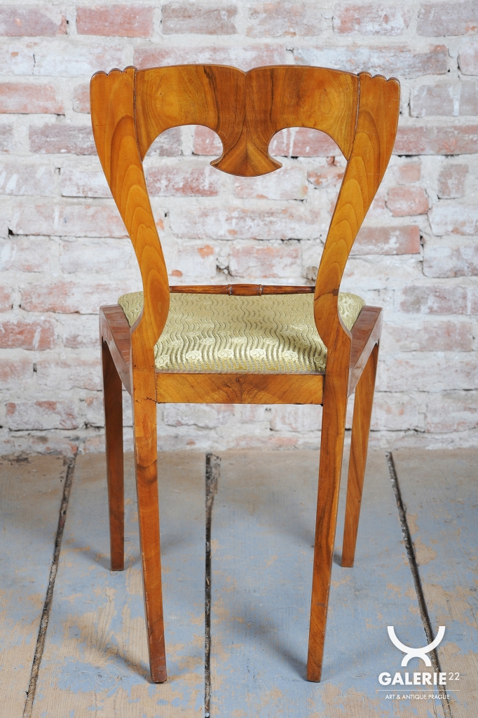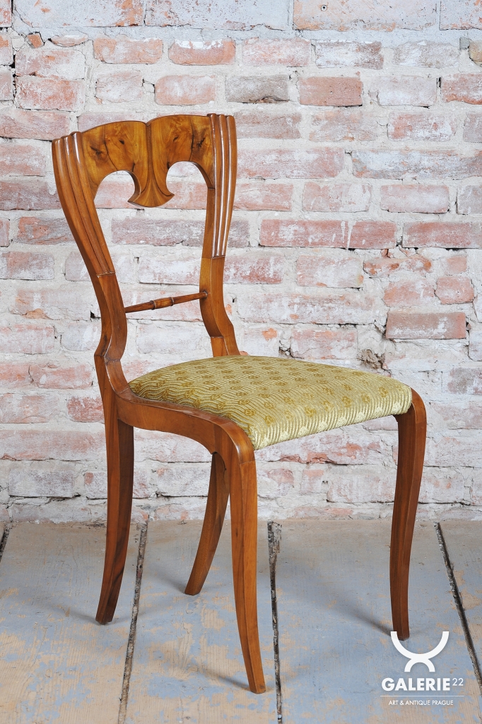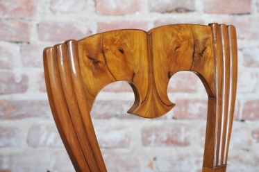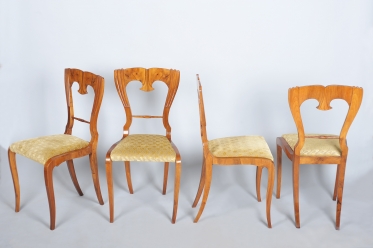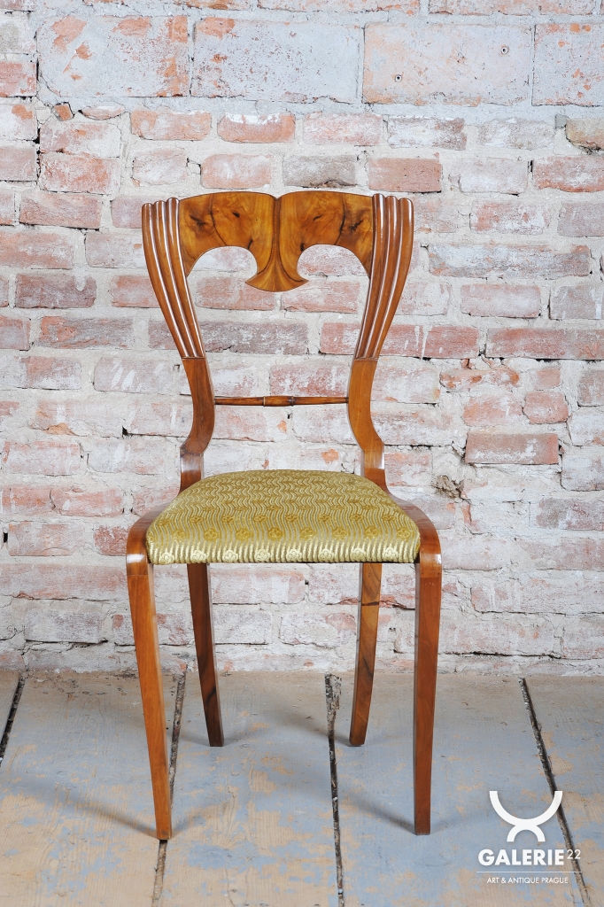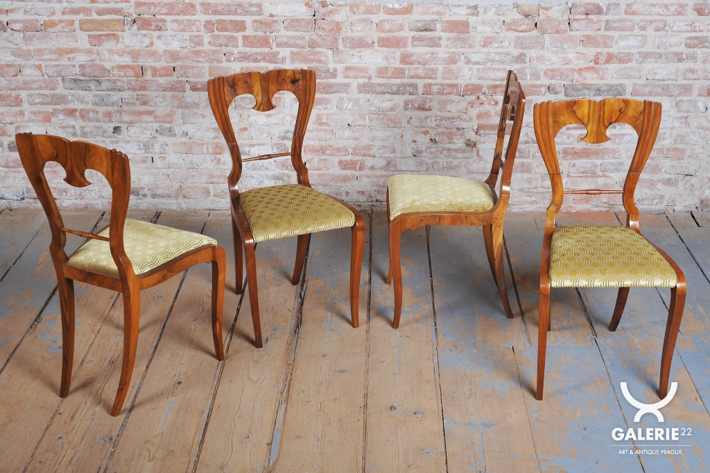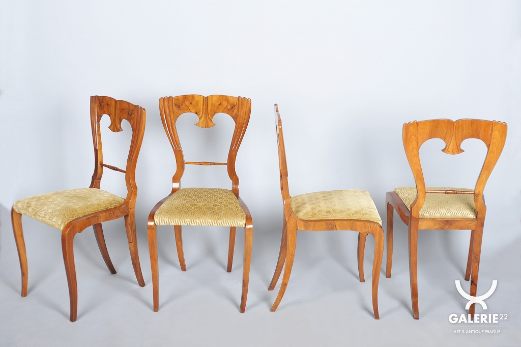 This set of four chairs is a noble example of Central European Biedermeier design from the mid-19th century, originating from Bohemia. The design features typical elements of this style, which emphasized bourgeois elegance, comfort, and the natural beauty of the materials. The frames are precisely veneered with premium walnut, whose rich grain adds a distinct character to each piece. As part of a professional restoration, the original wood polish was sensitively revived, restoring the woods depth and noble luster while preserving its historical patina.