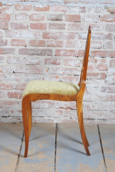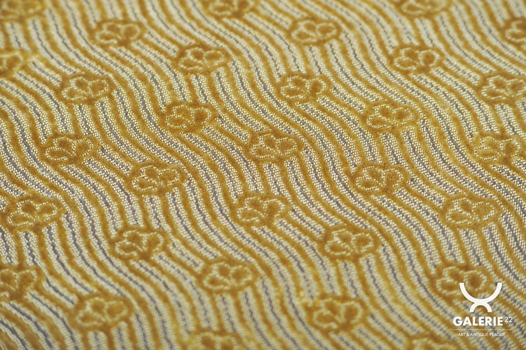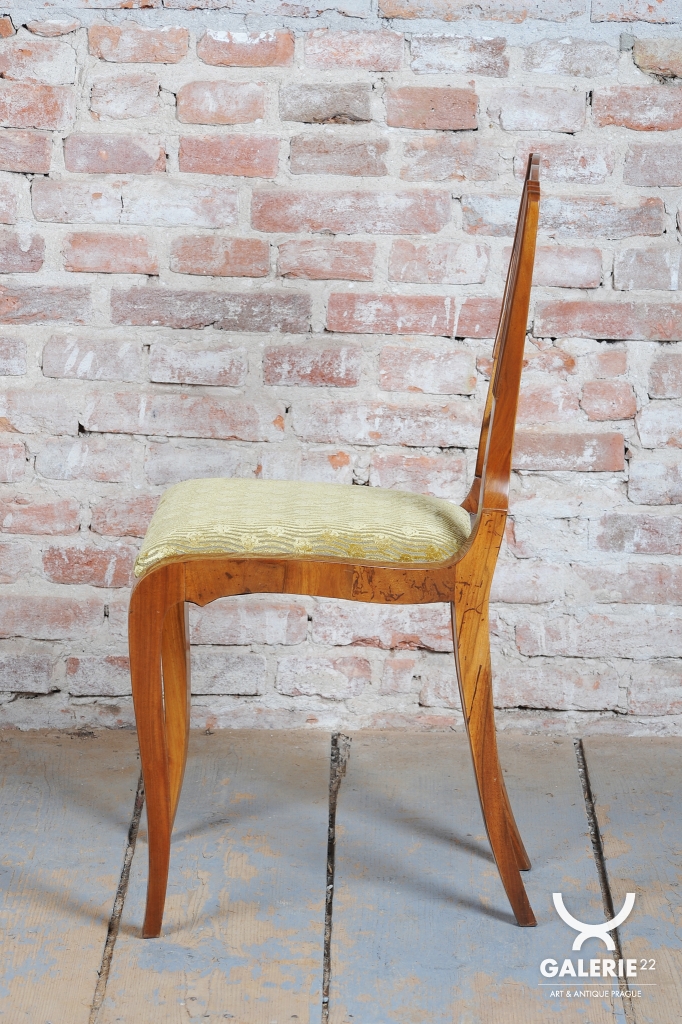 The exceptional added value of this set is enhanced by new professional upholstery, applied in a luxurious period-style fabric. The fabric, featuring a delicate floral and ornamental pattern in gold tones, perfectly corresponds with the aesthetics of the mid-19th century, while the soft seat ensures high comfort of use. The chairs are in perfect technical and visual condition, representing not only fully functional furniture for a dining room or salon but also a stable collectors and financial investment.