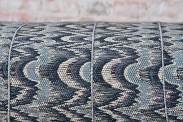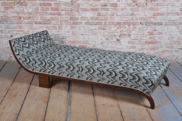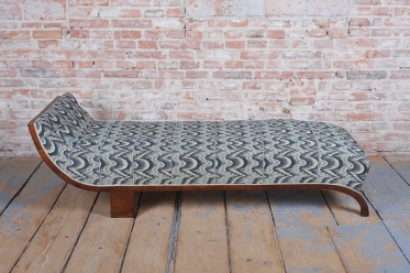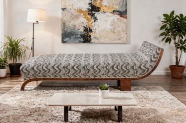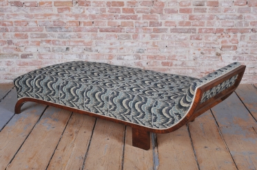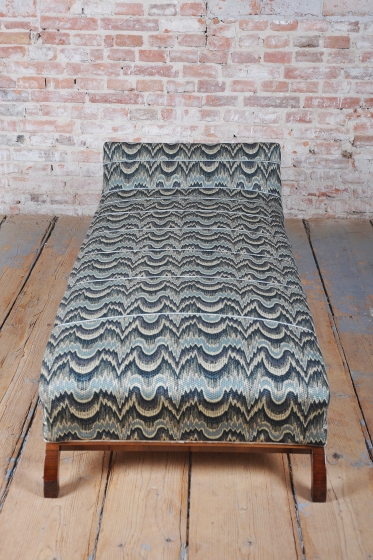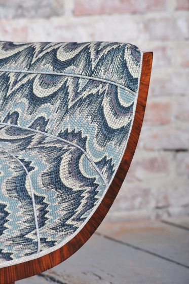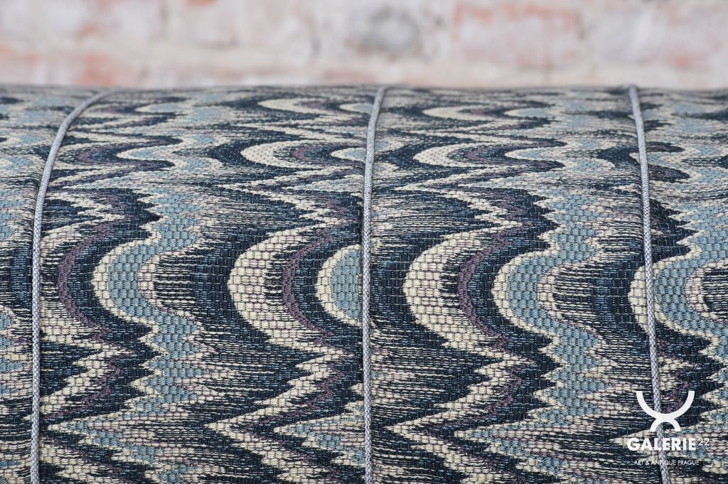 A key feature of this piece is the new professional upholstery, featuring a stylish period-appropriate fabric from the renowned French brand Nobilis Paris. The fabrics characteristic geometric flame pattern in a contemporary color palette provides the sofa with a fresh and timeless look that harmonizes perfectly with its historical foundation. The fabric is specifically designed for upholstery, guaranteeing high durability and a long lifespan even with daily use. For maximum authenticity and comfort, the sofa is equipped with traditional spring upholstery, offering stability and a soft seating experience.