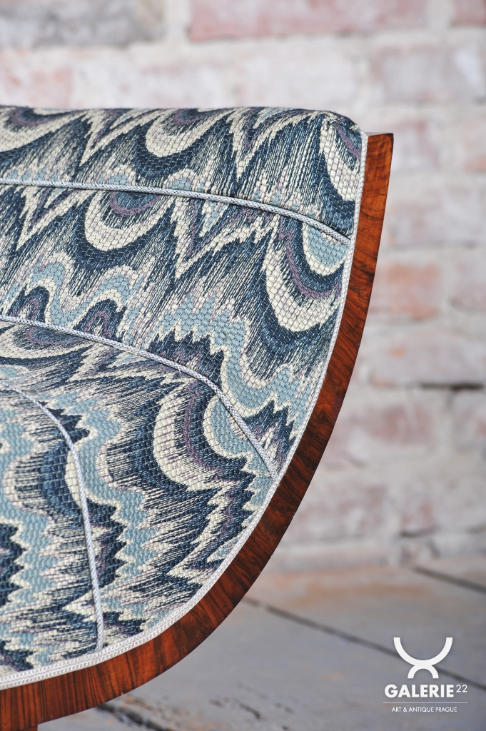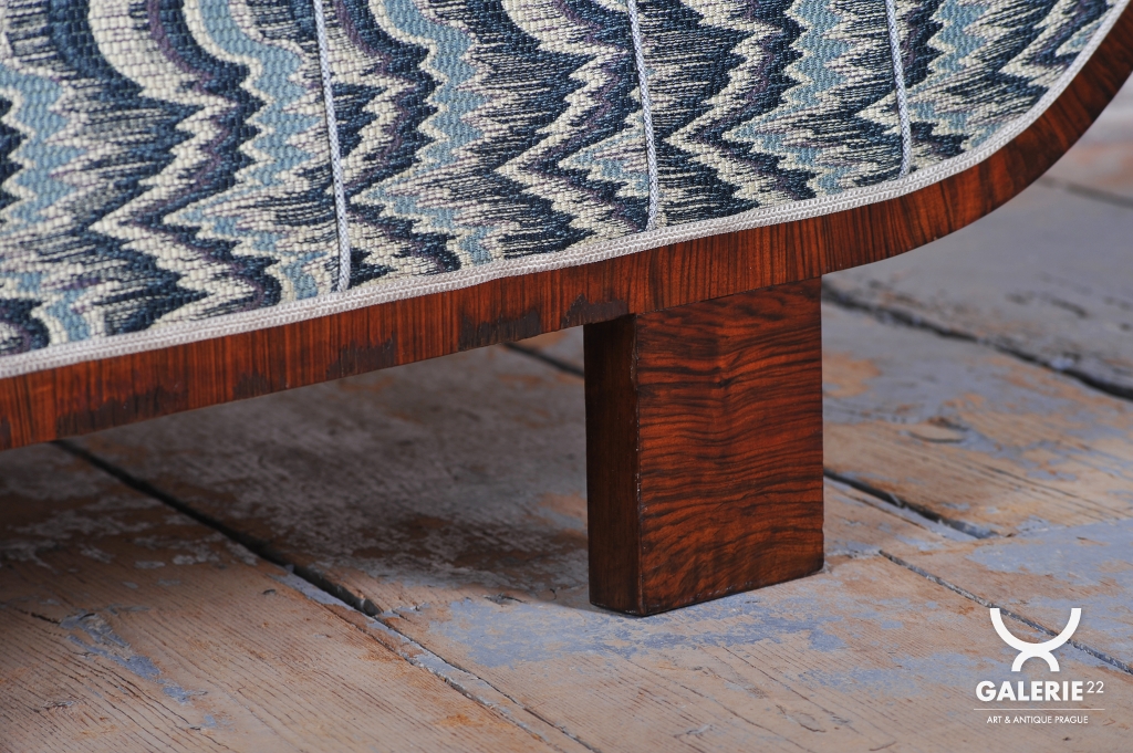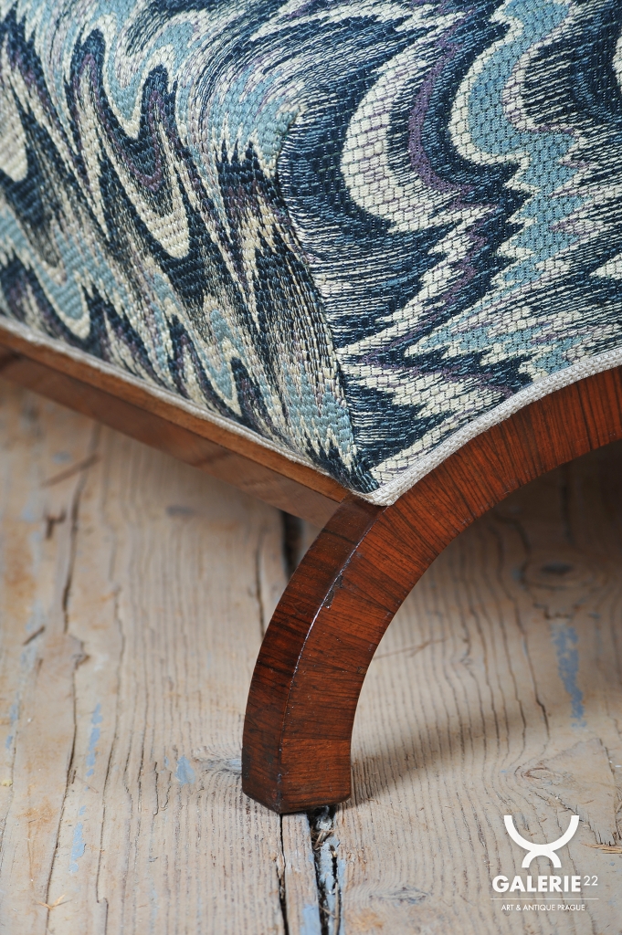 This sofa is a prime example of 1920s Czechoslovak Art Deco, combining period luxury with extraordinary craftsmanship. The rounded shapes and sophisticated design are typical of this era, embodying the contemporary ideal of absolute comfort and elegance. The construction is made of solid beech veneered with walnut, highlighting the natural grain of the wood. As part of a professional restoration, the original polish was sensitively revived, restoring the furnitures deep luster and representative character.