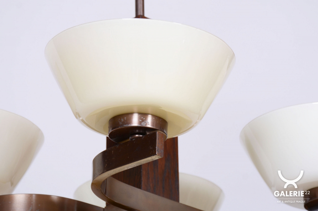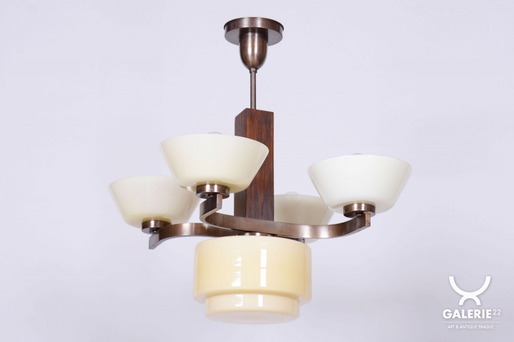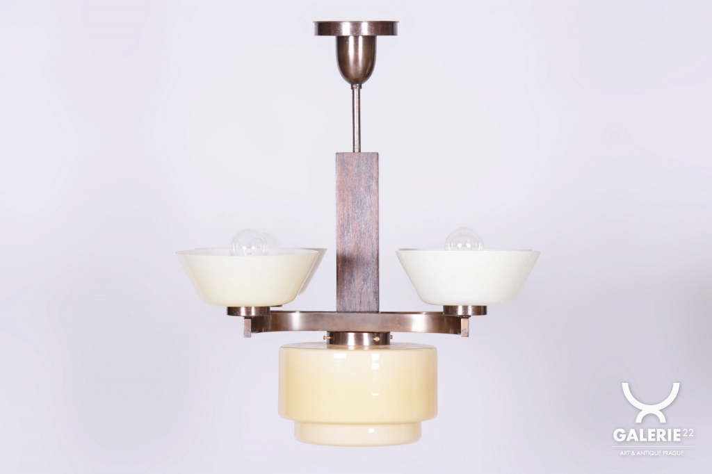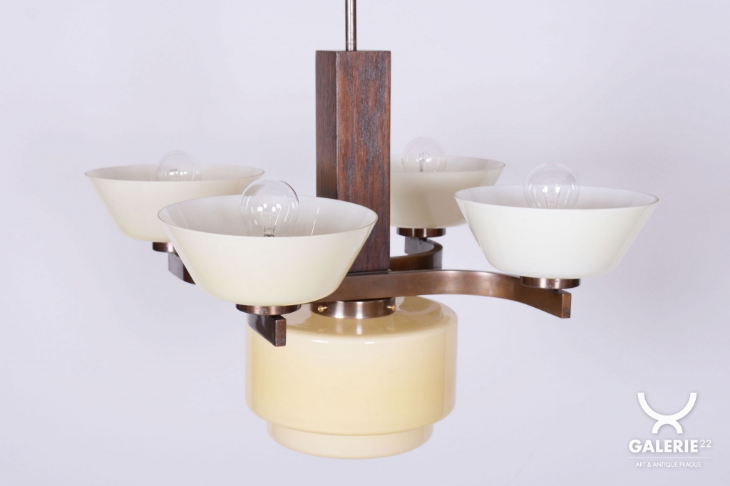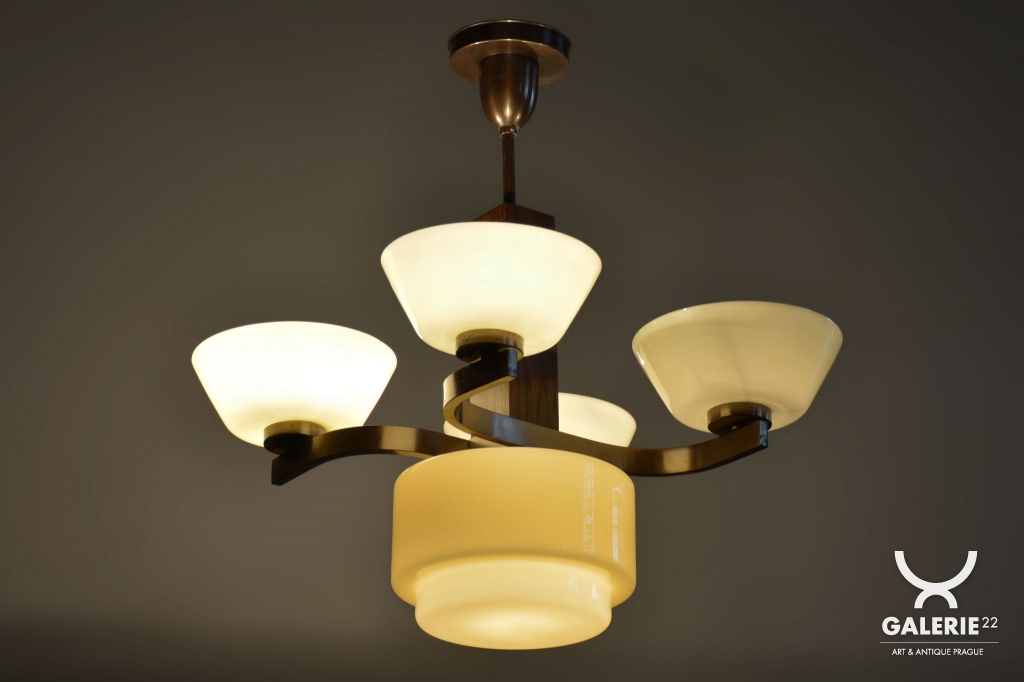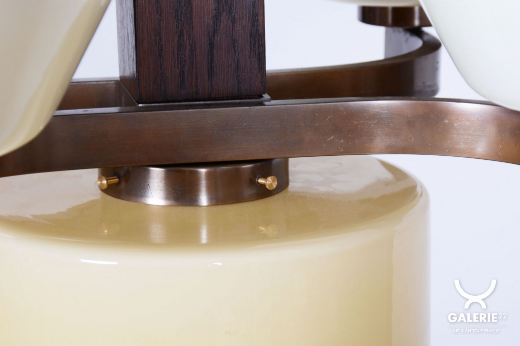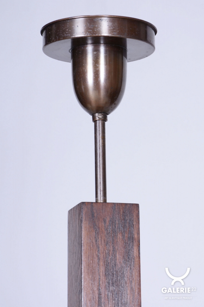 This 4-arm chandelier is a masterpiece of 1920s Czechoslovak Art Deco. The lighting fixture presents a fascinating combination of geometric austerity and luxurious material design, typical of high-end interwar interiors. The dominant feature is the central wooden element made of solid oak, featuring a revived original polish that highlights the deep texture of the wood.