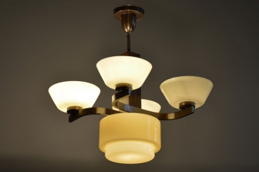 The structure is complemented by arms made of professionally cleaned patinated brass, which has retained its historical nobility and contrasts beautifully with the milky glow of the opal glass shades. These bell-shaped shades with subtle stepping perfectly diffuse light, creating a sophisticated atmosphere. A remarkable technical detail is the wiring configuration, which, thanks to the new professional electrification, is designed as a split circuit (dual-switch) – allowing you to light either a portion of the arms or all of them at once for maximum illumination.