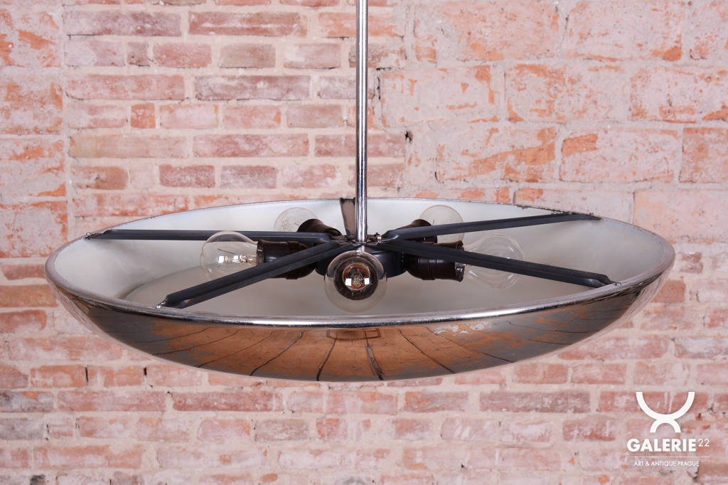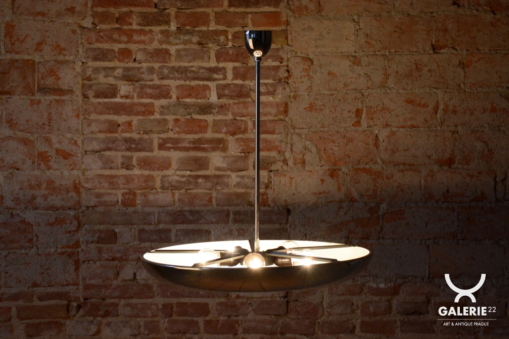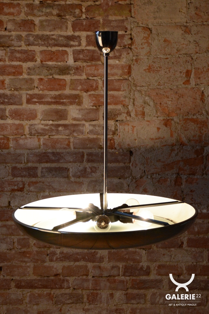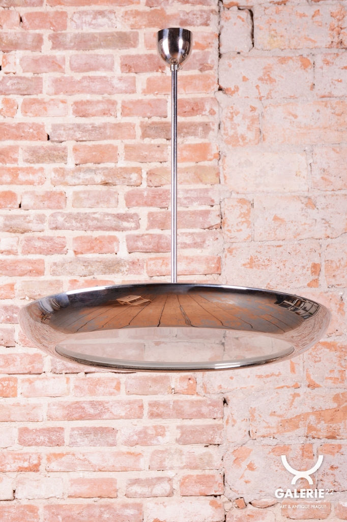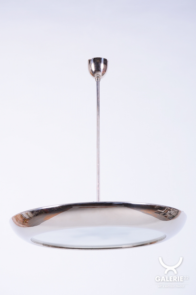 This iconic pendant, familiarly nicknamed UFO, is one of the most prominent lighting fixtures of Czechoslovak functionalism and Bauhaus design from the 1930s. The renowned architect and designer Josef Hurka created this timeless design. His work for the Napako company defined the modern look of interwar lighting. The pendant stands out for its aerodynamic form and purity of design, which remains very modern even after almost a hundred years.