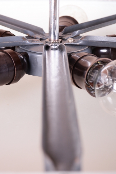 The item underwent professional restoration, returning it to its original luster. The chrome plated steel construction was professionally cleaned and complemented by a characteristic milk glass shade, providing diffused and glare free light. As part of the renovation, new electrical wiring was installed, making the chandelier ready for immediate installation and safe operation. This is a highly valued collector piece that forms a stylish centerpiece for any functionalist interior.